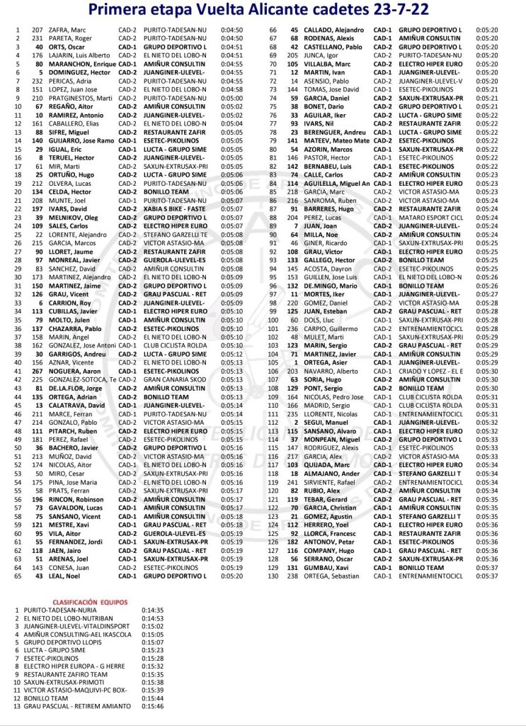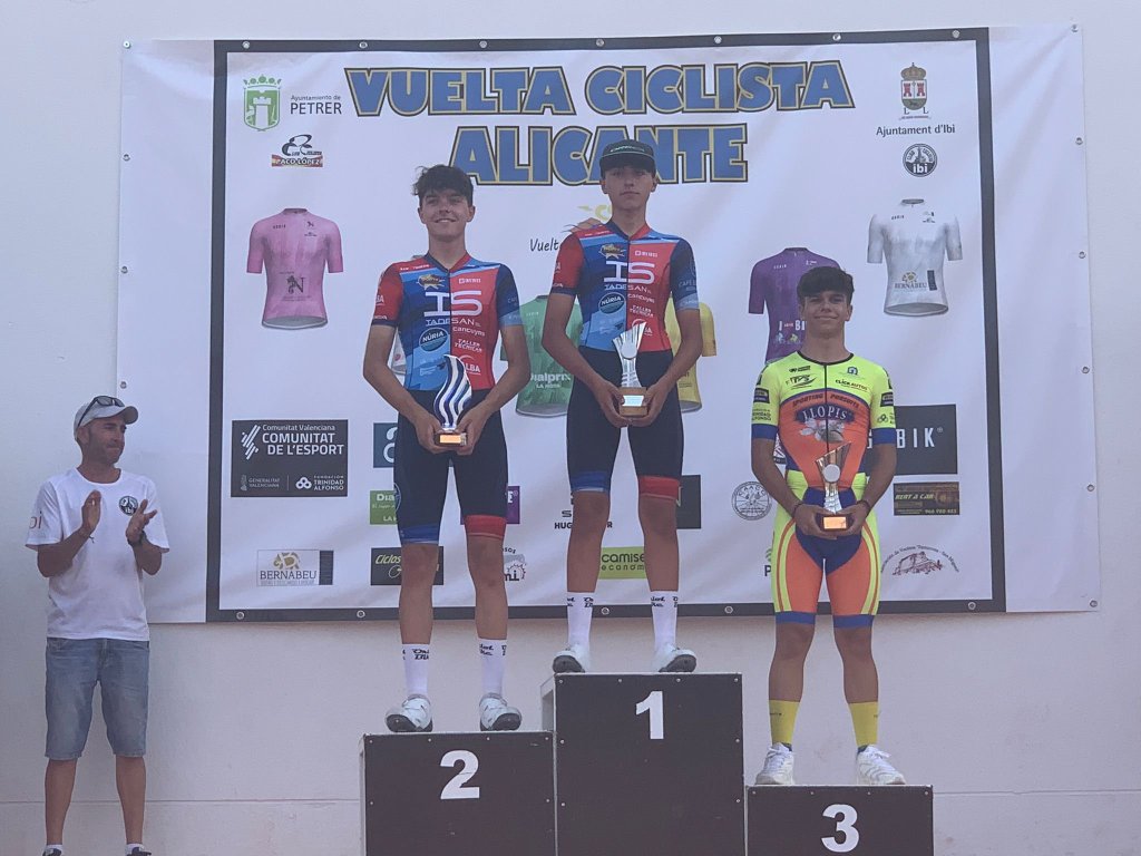 Doblete del Purito Tadesan en la primera etapa de la Vuelta Ciclista a Alicante Cadete que se ha disputado en Ibi, una contrarreloj de 3,5 kilómetros que ha tenido salida en el Parc de les Hortes. Marc Zafra ha sido el ganador del «Trofeo Barrio de San Miguel» parando el reloj en 0:44:50. Su compañero de escuadra Roger Pareta ha terminado segundo, con el mismo tiempo, mientras que Óscar Orts (GD Llopis) concluye tercero y primer joven, a tan solo un segundo del vencedor. Puesto 13 para Miquel Sifre (Zafiro Team); catorce, para José Ramón Guijarro (Esetec Pikolinos) ; y quince, para Eric Igual (Lucta). Por escuadras se ha impuesto en Purito. Orts ha sido el primer joven y se ha vestido con los maillots de primer provincial y de la Comunitat. «La contrarreloj se me presentaba bien y tenía buenas sensaciones pese a ser un recorrido corto. Estoy contento. Mañana a darlo todo e intentar mantener los lideratos conseguidos y lucharé también por intentar optar al liderato de la general absoluta», apunta el ciclista del GD Llopis. En féminas, Claudia Castaño (Valverde Team) ha sido la mejor. Tania Silvente finaliza segunda y Aitana Calabuig, tercera.