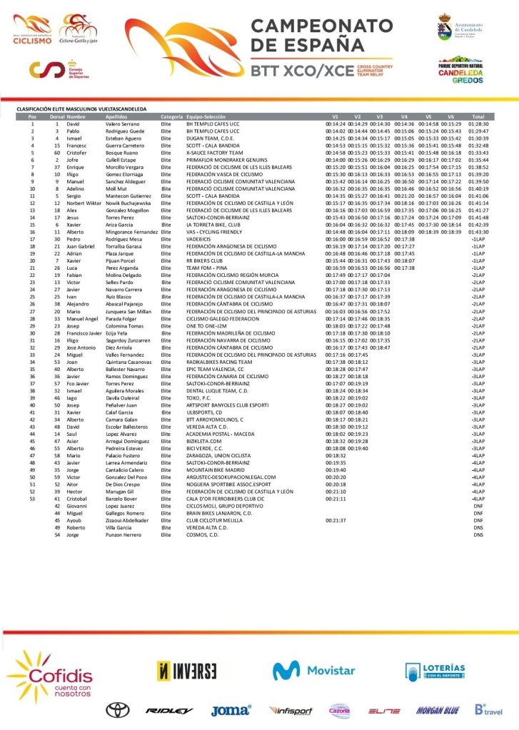 No hubo sorpresa en la categoría élite. David Valero ha ganado su séptimo título de campeón de España XCO. La prueba masculina estuvo más reñida, y tras un ataque en la primera vuelta de Jofre Cullel y Pablo Rodriguez, Valero tuvo que cerrar un hueco de unos 25 segundos para llegar hasta cabeza de carrera en la vuelta 3. Ismael Esteban mantuvo su tercera posición a unos 15 segundos de Valero y Rodriguez mientras que Cullel saltaba hasta la cuarta plaza. A falta de 2 vueltas, el granadino David Valero atacó a su compañero de equipo para llegar en solitario hasta meta y hacerse con el séptimo titulo de Campeón de España. Pablo Rodríguez fue segundo a casi 1 minuto, y el podio lo cerró Ismael Esteban.