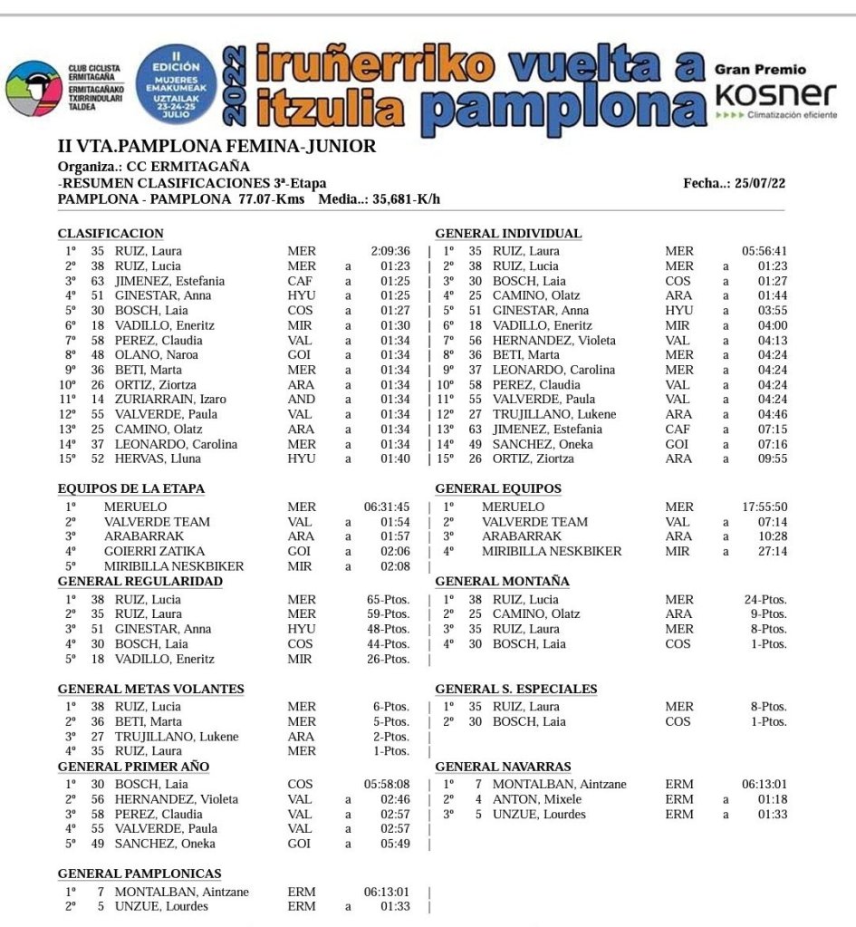 Laura Ruiz (Meruelo) ha ganado en la pequeña rampa del Caballo Blanco en la capital navarra, final de la tercera etapa, y se ha adjudicado la Vuelta Ciclista a Pamplona de Féminas Júnior. Su tiempo ha sido de 2:09:36. A casi minuto y medio ha llegado el pelotón encabezado por Lucía Ruiz (Meruelo). Estefanía Ruiz ha sido tercera y Anna Ginestar (Hyundai), ganadora de la segunda etapa, cuarta. Séptima plaza para Claudia Pérez (Valverde Team). Puesto 28 para Laura Guardeño (Valverde).
