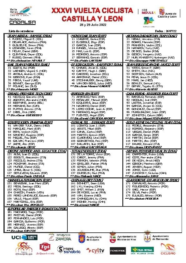 En total 19 escuadras acuden a la ronda castellano y leonesa: seis World Teams (Movistar Team, Astana Qazaqstan, UAE Emirates, BikeExchange-Jayco, EF Education-Easypost e Israel Premier Tech); nueve Pro Teams (Burgos BH, Caja Rural-Seguros RGA, Kern Pharma, Euskatel Euskadi, Eolo Kometa, Drone Hopper Androni Giocattoli, Total Energies, Arkea Samsic y Human Powered Health) y cuatro Continentales UCI (Manuela Fundación, China Glory, Glassdrive-Q8-Anicolor y Radio Popular-Paredes-Boavista). Vincenzo Nibali, David de la Cruz, Simon Yates y Jai Hindley son algunos de los participantes además de los alicantinos Manuel Peñalver (Burgos BH) y Eugenio Sánchez (Kern Pharma). El torrevejense regresa tras dos meses recuperándose de la lesión que sufrió tras la grave caída que sufrió en el Touyr de Turquía. Al final, Juan Ayuso no toma la salida.