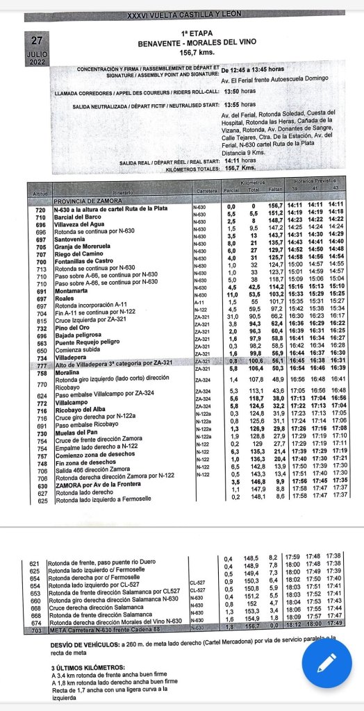 La organización de la XXXVI Vuelta Ciclista Internacional a Castilla y León modificó ayer el recorrido de la primera de las dos etapas previstas, que se corre hoy miércoles 27 de julio, aunque con un cambio de recorrido debido al incendio de Losacio (Zamora) que está activo y que afecta a parte del trayecto previsto inicialmente. Tendrá como salida Benavente y llegada Morales del Vino, tal y como figuraba en un principio, pero se recorta la distancia a 156,7 kilómetros evitando de esta forma transitar por localidades en riesgo de incendios en la provincia de Zamora. De esta forma, no atravesará la Sierra de la Culebra de Zamora, ni pasará por Tábara de Aliste. Asimismo desde esta Organización «queremos mostrar nuestra solidaridad con las localidades y personas afectadas por los incendios por donde transcurría esta primera etapa así como con todas los municipios afectadas por los incendios este verano en Castilla y León».