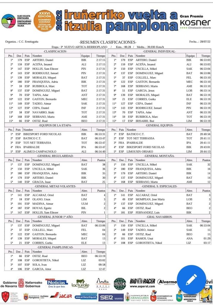 Daniel Artero (Bidesport) ha sido el ganador de la tercera jornada de la Vuelta Ciclista a Pamplona Júnior que ha comenzado en Nuevo Artica y finalizado en Berrioplano, tras 91 kilómetros de recorrido. Su tiempo ha sido de 2:17:15. Ha batido al esprint a su compañero de fuga Imanol Aceña (Alimco). A 16 segundos ha entrado un grupo de veintidós corredores entre los que estaba Daniel Cepa (Infinobras), que ha finalizado en el puesto duodécimo. Daniel Artero es el nuevo líder de la ronda navarra y Cepa está a 15 segundos del primer clasificado y se encuentra con todas opciones de triunfo intactas de cara a la última jornada.