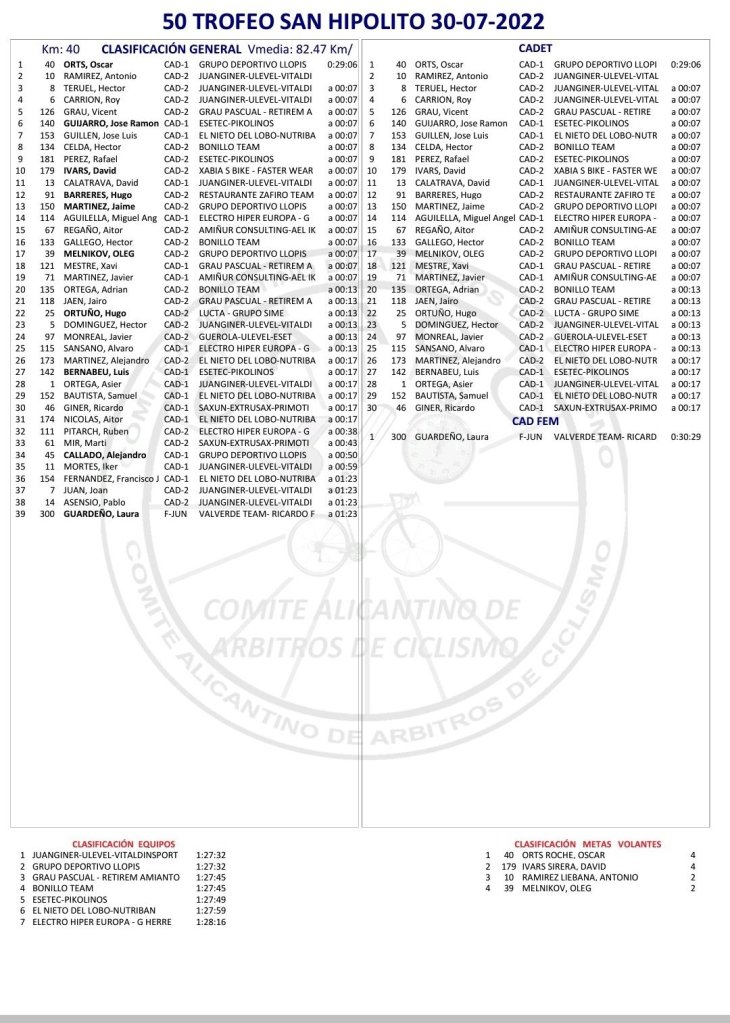 Óscar Orts (GD Llopis) ha sido el ganador esta mañana del 50 Trofeo de Ciclismo San Hipólito para corredores cadetes disputado en Cocentaina y organizado por el CC Contestà.. Orts, que hoy estrenaba una nueva bicicleta que le ha preparado la tienda Guijarro Tot Sport, ha parado el reloj en los 29 minutos y seis segundos. Con el mismo tiempo ha entrado Antonio Ramírez (JuanGiner), mientras que Héctor Teruel (JuanGiner) ha completado el podio. José Ramón Guijarro (Esetec Pikolinos) termina sexto; Rafael Pérez (Esetec), noveno; y David Ivars (Xabia’s Bike), décimo. El premio por equipos se lo ha adjudicado el JuanGiner y las metas volantes Orts. Parafreseando al mundo del fútbol, en el que se afirma que a cambio de entrenador, victoria segura, en este caso se puede afirmar que a sustitución de bicicleta, triunfo seguro.