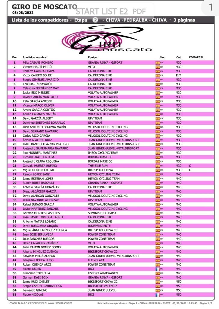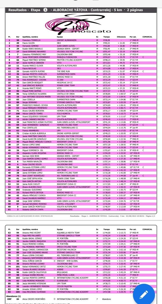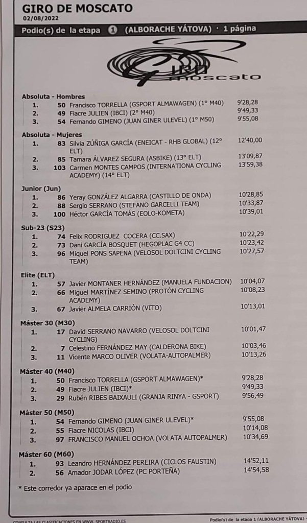 Francisco Torrella (Gsport Almawagen) se ha impuesto en la primera etapa del Giro Moscato, una CRI de 5 kilómetros, disputada entre Alborache y Yátova. Fiacre Julien (Ibci) ha sido segundo y Fernando Gimeno (JuanGiner), tercero. David Serrano (Velosol) ha sido el primer M30; Francisco Torrella se ha impuesto en M40; Fernando Gimeno (JuanGiner), en M50; Leandro Hernández (Faustin), en M60; Javier Montaner (Manuel Fundación), en élite; Félix Rodríguez (CC Sax), en sub 23; Yeray González (Castillo de Onda), en júniors; Silvia Zúñiga (Eneicat), en élite féminas.