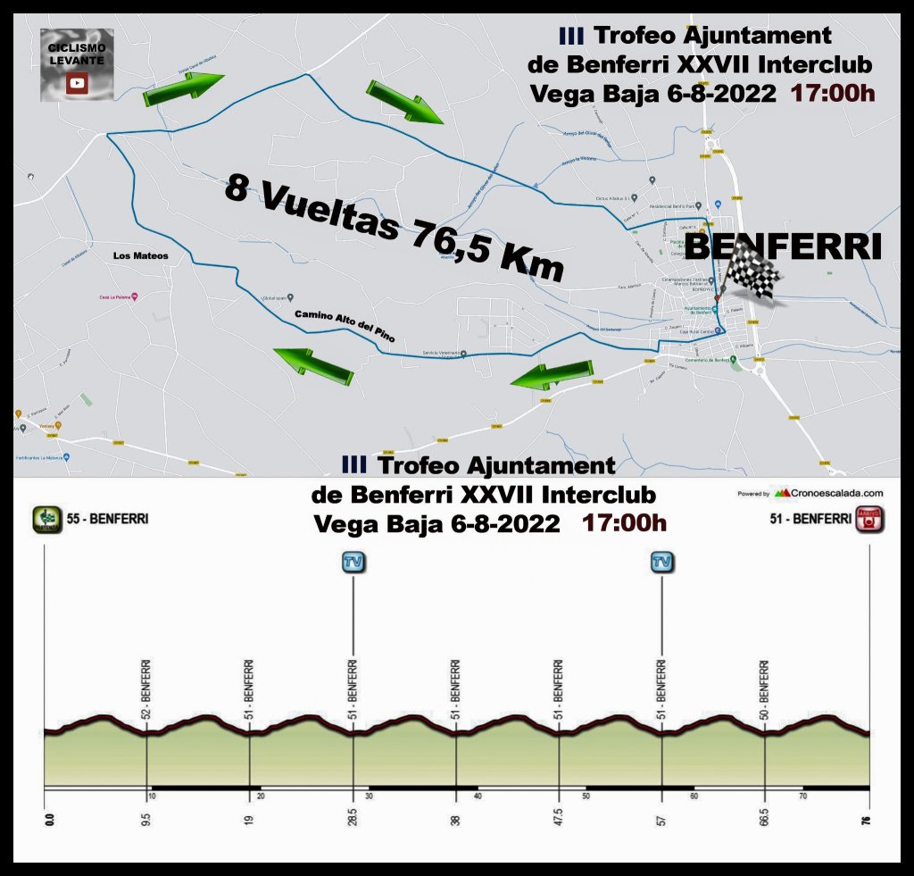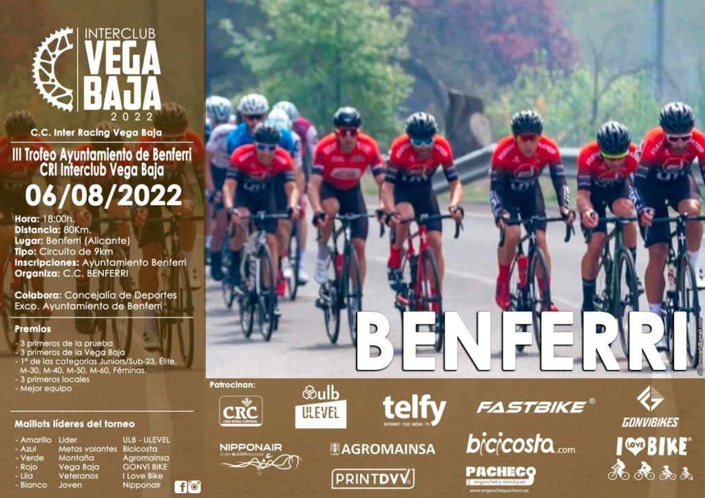 El III Trofeo Ayuntamiento de Benferri pondrá el sábado el punto y final a la XXVII edición de la Interclub Vega Baja 2022. La prueba comenzará a las cinco y el pelotón tendrá por delante 76,5 kilómetros de recorrido. El calor y el viento pueden marcar el devenir de la carrera. Al final de la misma, se llevará a cabo la gala de entrega de premios a cargo de la organización de la Interclub.