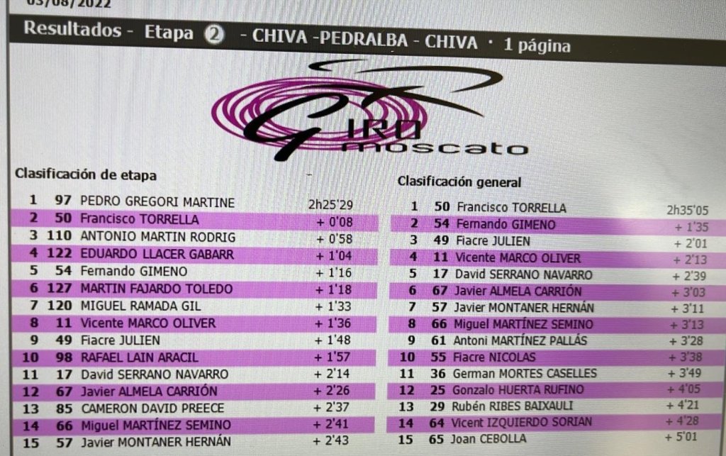 Pedro Gregori Martínez (Vito) ha sido el ganador de la segunda etapa del Giro Moscato que ha tenido salida y meta en Chiva. Su tiempo en meta ha sido de 2:25:29. A ocho segundos ha entrado Francisco Torrella (Gsport) y ya a 58 segundos ha accedido a meta Antonio Martín Rodríguez. Torrella sigue de líder, con Fernando Gimeno (JuanGiner), segundo, a 1’35»,y Fiacre Julien (IBCI) es tercero.
