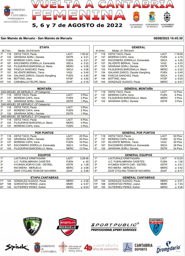 En la General, Paula Ostiz es primera, con Irene Moreno, segunda y Esmeralda Racionero, tercera. Claudia Xiangfeng ha sido octava en la etapa y séptima en la General. Gran etapa de la alicantina, siempre en cabeza con el grupo perseguidor de Ostiz.