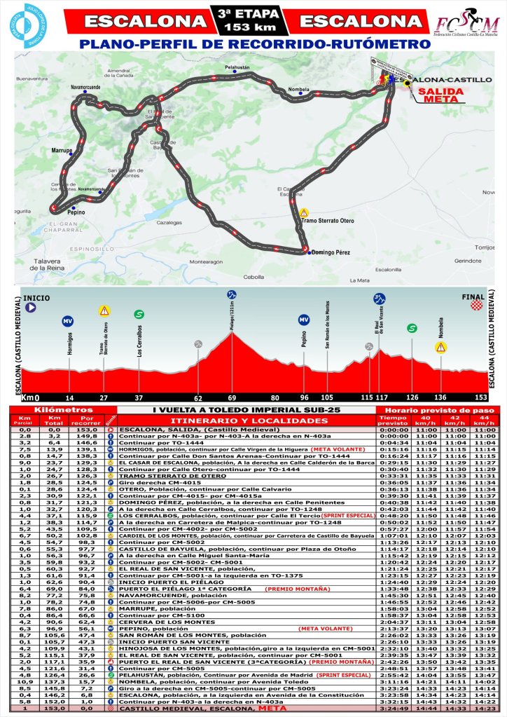 El domingo 7 de agosta la carrera se decidirá en un recorrido circular con salida y llegada a Escalona. 148 kilómetros y 2.300 metros de desnivel que esconden la subida al Puerto del Piélago (que también se ascenderá en La Vuelta a España 2022), al Real de San Vicente, mucho terreno quebrado de emboscadas y final llano en la avenida principal de Escalona. Sobre las 15.00 ya se conocerá al primer ganador de la Vuelta a Toledo Imperial sub-25.