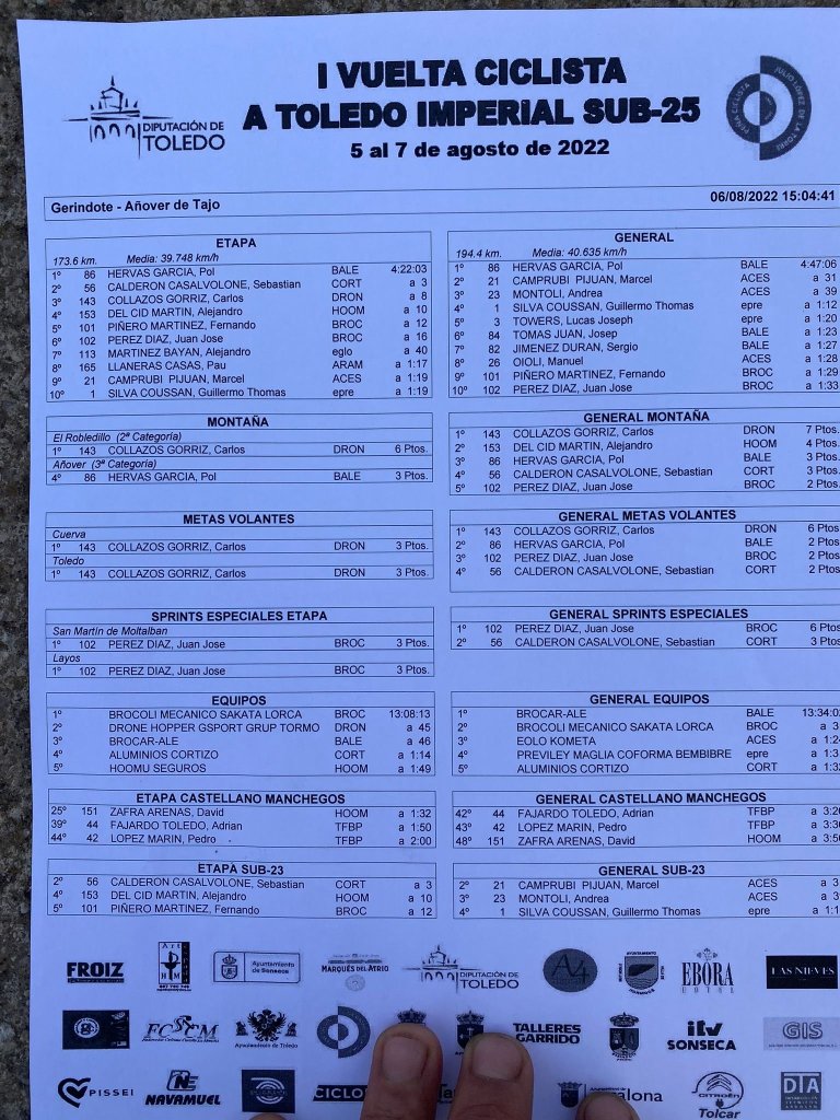 Pol Hervás (Brocar Alé) se ha vestido de líder de la Vuelta a Ciclista Toledo Imperial tras imponerse en la segunda etapa, la primera en línea, que ha llevado al pelotón de Gerindote a Anover del Tajo, tras 174 kilómetros de recorrido. El corredor de la Fundación Benicadell ha parado el reloj en las horas, 22 minutos y tres segundos. Sebastián Calderón (Cortizo) ha sido segundo y Carlos Collazos (Drone), tercero. Josep Tomàs (Brocar Alé) termina sexto y su compañero de escuadra, Sergio Jiménez, séptimo.
