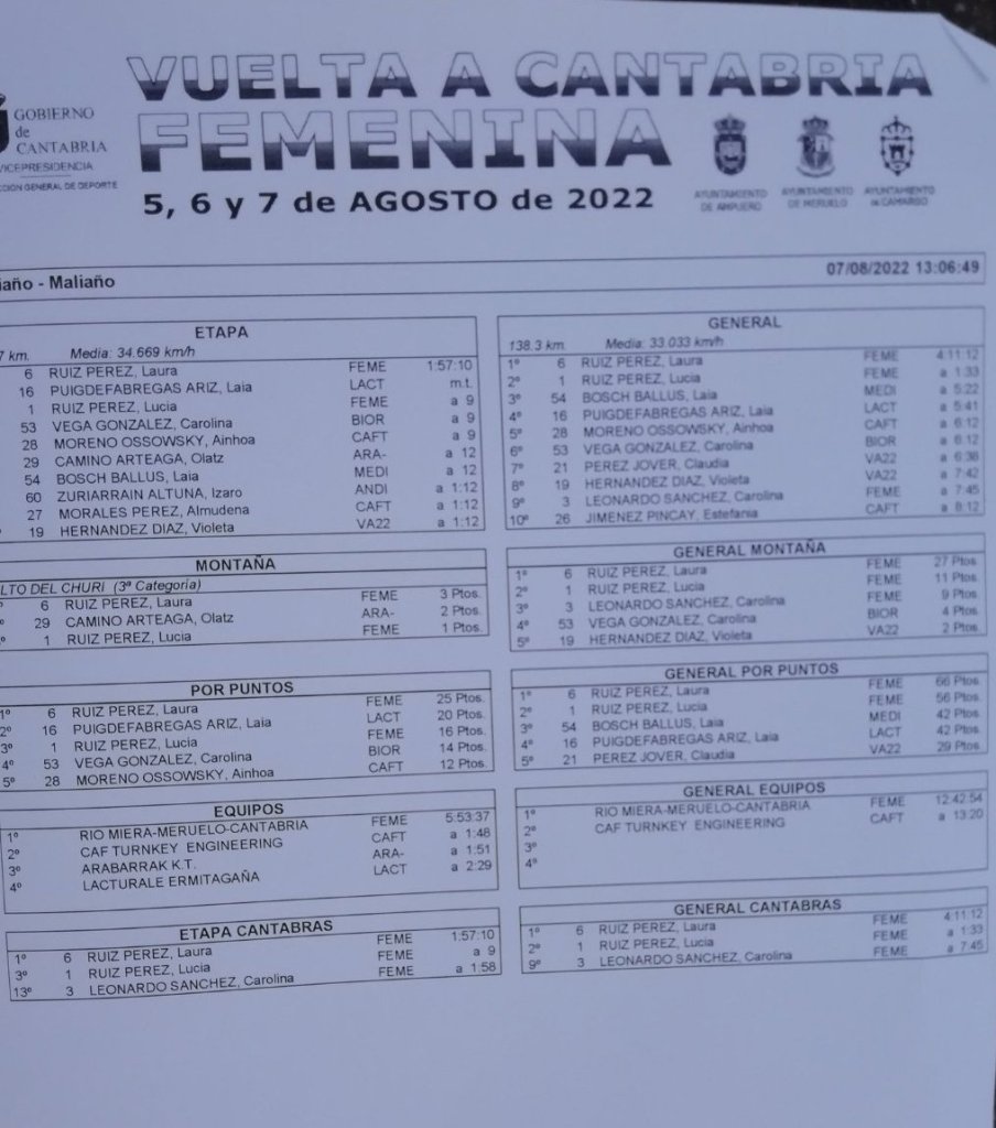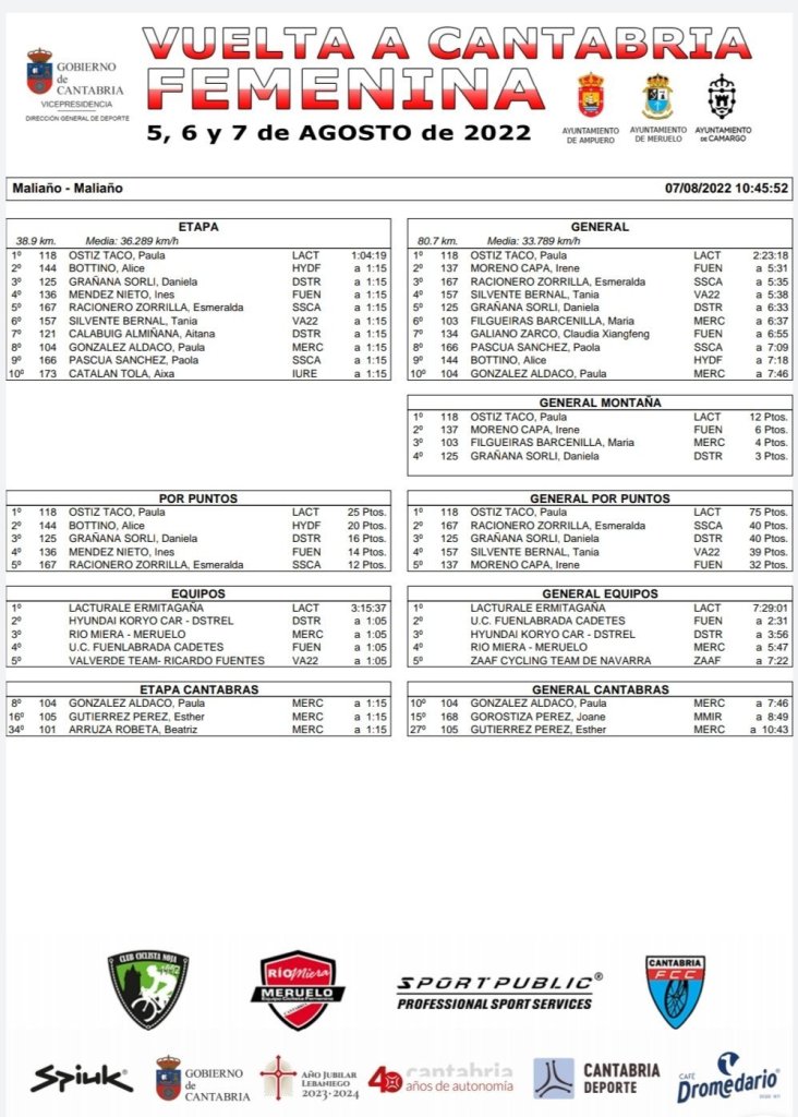 Paula Ostiz (Lacturale) ha ganado la tercera y última etapa de la Vuelta Cantabria Femenina Cadete. A 1:15 han entrado Alice Bottino y Daniela Grañana. Ostiz se ha llevado la General y le han acompañado en el podio Irene Moreno y Esmeralda Racionero. La navarra también se ha adulta los maillots de Montaña y Puntos. Meritorio séptimo puesto en la General de Claudia Xiangfeng (Fuenlabrada).