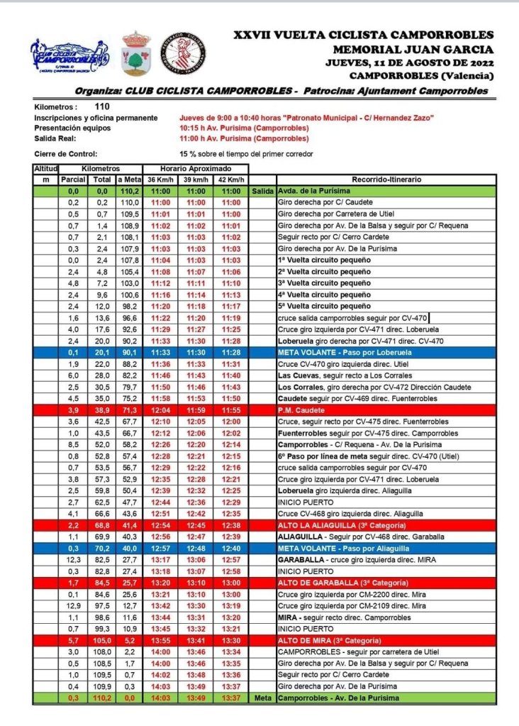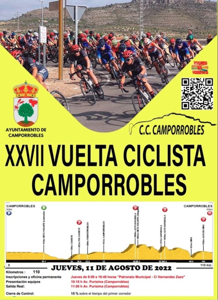 La XXVII Vuelta Ciclista a Camporrobles, conocida como «Memorial Juan García», se celebra el el jueves 11 de agosto de 2022, a partir de las once, con la presencia de 200 corredores de un total de 20 equipos de todo el territorio nacional entre los que están los alicantinos Infinobras, Saxun Extrusax Primoti y Guijarro Sporting Pursuits.