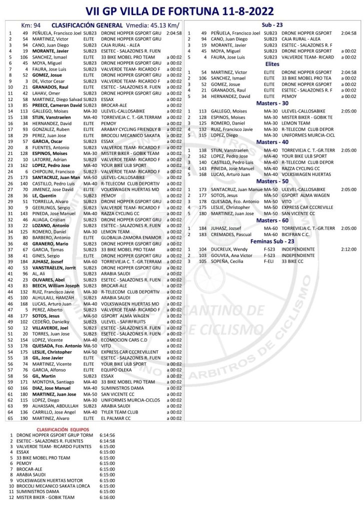 Francisco Joel Peñuela (Drone Hopper) se ha impuesto en GP Villa de Fortuna, categoría Open, que ha contado con 95 kilómetros de recorrido. Víctor Martínez ha sido segundo y Juan Diego Cano (Filial Caja Rural) ha completado el podio. Con el tiempo del ganador, en cuarta posición ha entrado el alicantino Javi Morante (Esetec). Josué Gómez (Drone Hopper) ha firmado un octavo puesto y Raúl Granados (Esetec), entra décimo.