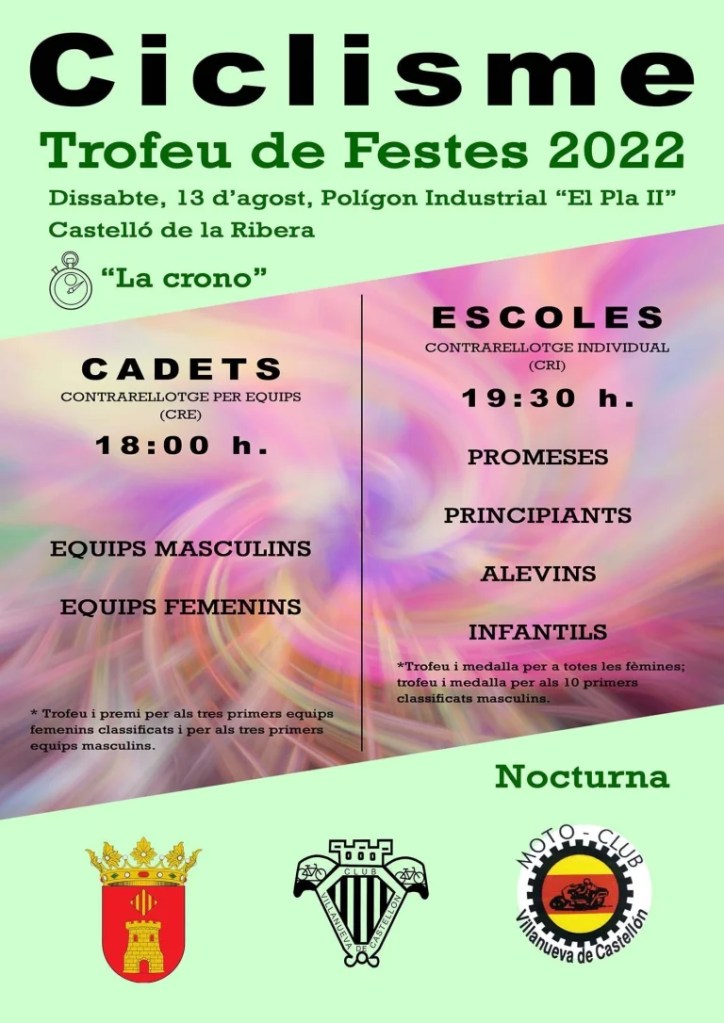 La contrareloj individual que fue suspendida por el intenso calor el pasado sábado en Castelló de la Ribera para las categorías de escuelas no se disputara finalmente durante este 2022 según fuentes del Club Ciclista Villanova de Castelló. Tampoco se correrá la crono por escuadras diseñada para la cadete. Los organizadores han pospuesto la celebración al 2023 después de que todo el trabajo se fuera al traste este pasado sábado.