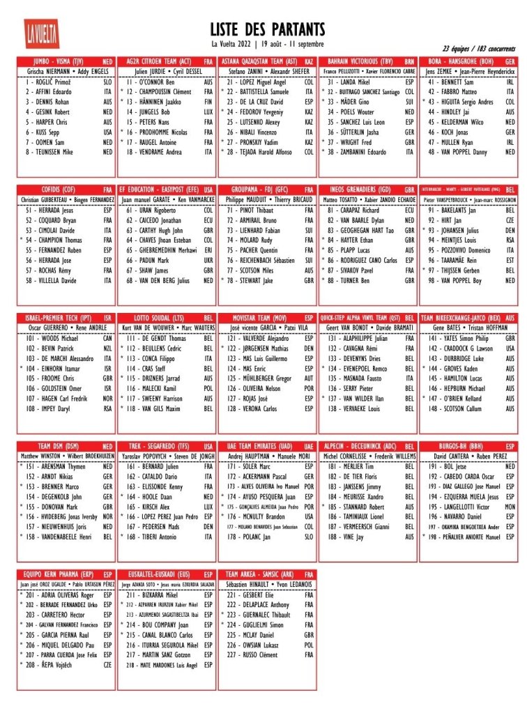 Los 22 equipos participantes en la 77ª edición de La Vuelta han sido presentados a los fans en Utrecht la tarde de este jueves, en la víspera de la etapa inaugural en la ciudad neerlandesa. El ganador de las tres últimas ediciones, Primož Roglič, ambiciona una conquista histórica, mientras Movistar Team se prepara para la despedida de Alejandro Valverde con un maillot especial que repasa sus éxitos durante 20 años. El campeón del mundo Julian Alaphilippe y su compañero Remco Evenepoel también desean brillar en la gran Vuelta española.