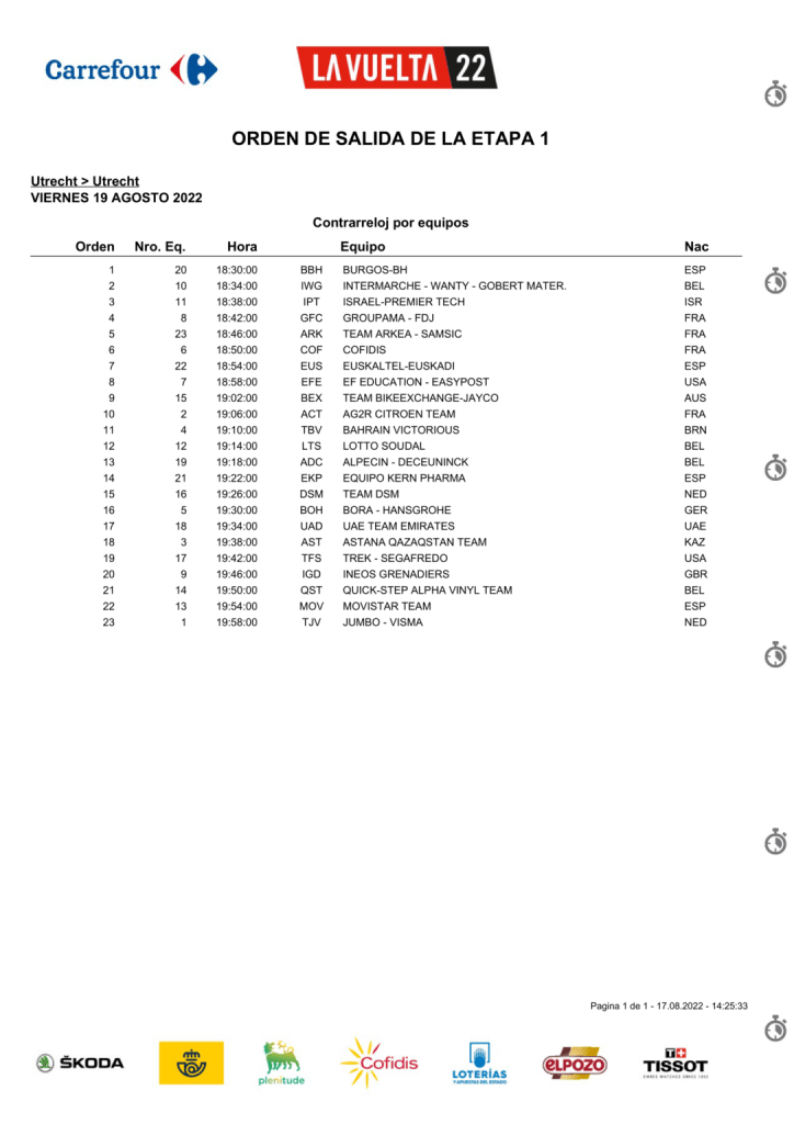 El viernes a las 11 de la mañana, en la sede central de La Vuelta 22 en Utrecht, la Alcaldesa de Utrecht, Sharon Dijksma, el concejal de Deportes del Ayuntamiento de Barcelona, David Escudé, y el Director General de La Vuelta, Javier Guillén, celebrarán juntos el paso del testigo de Utrecht a Barcelona como punto de salida de La Vuelta 23. La carrera empezará posteriormente por la tarde, una CRE, con el Burgos-BH de Manuel Peñalver tomando la salida a las 18:30h.