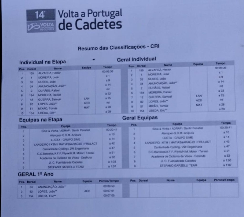 Héctor Álvarez (Lucta-Grupo Sime) se ha vestido de líder en la Volta a Portugal cadete tras ganar el prólogo, una contrarreloj individual de 5 kilómetros disputada en Alpiarça. El campeón España de la modalidad ha volado. José Moreira ha sido segundo y Joao Nunes, tercero. Eric Igual (Lucta-Grupo Sime) ha sido décimo.