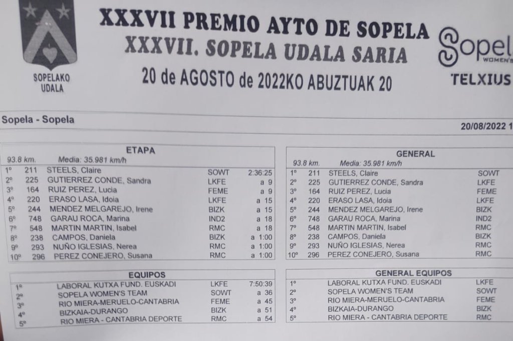Claire Steels (Sopela Womens Team) se ha adjudicado hoy el Gran Premio Ayuntamiento de Sopela por delante de Irene Méndez (Bizkaia Durango) y de Isabel Martín (Río Miera). Top 20 para Cristina Barrajón (Sopela), en la que era su última prueba de la temporada. La alicantina ha tenido varios problemas mecánicos, con cambio de bicicleta incluido, que le han impedido estar más adelante, aunque ha trabajado duro para su compañera Steels.