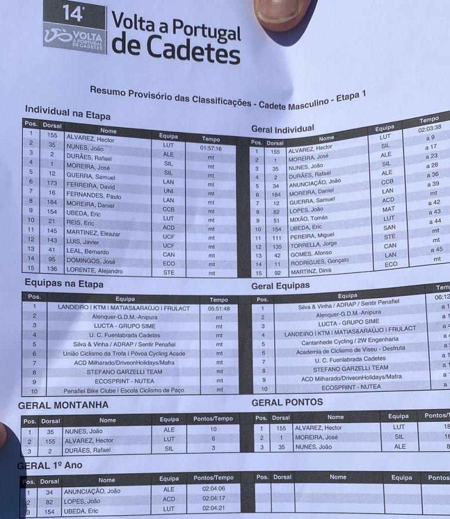 El ganador del prólogo de ayer, Héctor Álvarez (Lucta/Grupo Sime) fue más fuerte, superando a João Nunes (Alenquer/G.D.M/Anipura) y Rafael Durães (Silva&Vinha/ADRAP/Sentir Penafiel). El benidormense, que volverá mañana de amarillo, desvela los detalles de la etapa de hoy. “Los primeros kilómetros fueron muy rápidos, con muchos ataques, pero siempre logramos controlar todo muy bien. En los últimos 10 kilómetros empezamos a centrarnos más en posicionarnos para el sprint final. Este se lanzó bastante temprano y terminó beneficiándome mucho. Mañana será una etapa dura, en la que tendremos que trabajar en equipo para poder mantener este liderato. Para mí llevar este maillot es un orgullo y espero que mañana podamos ganar esta carrera”, señaló el corredor del Lucta-Grupo Sime.