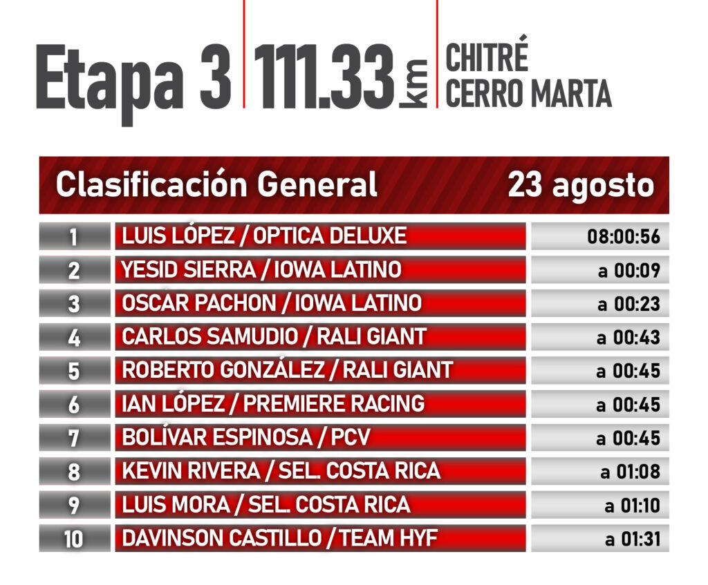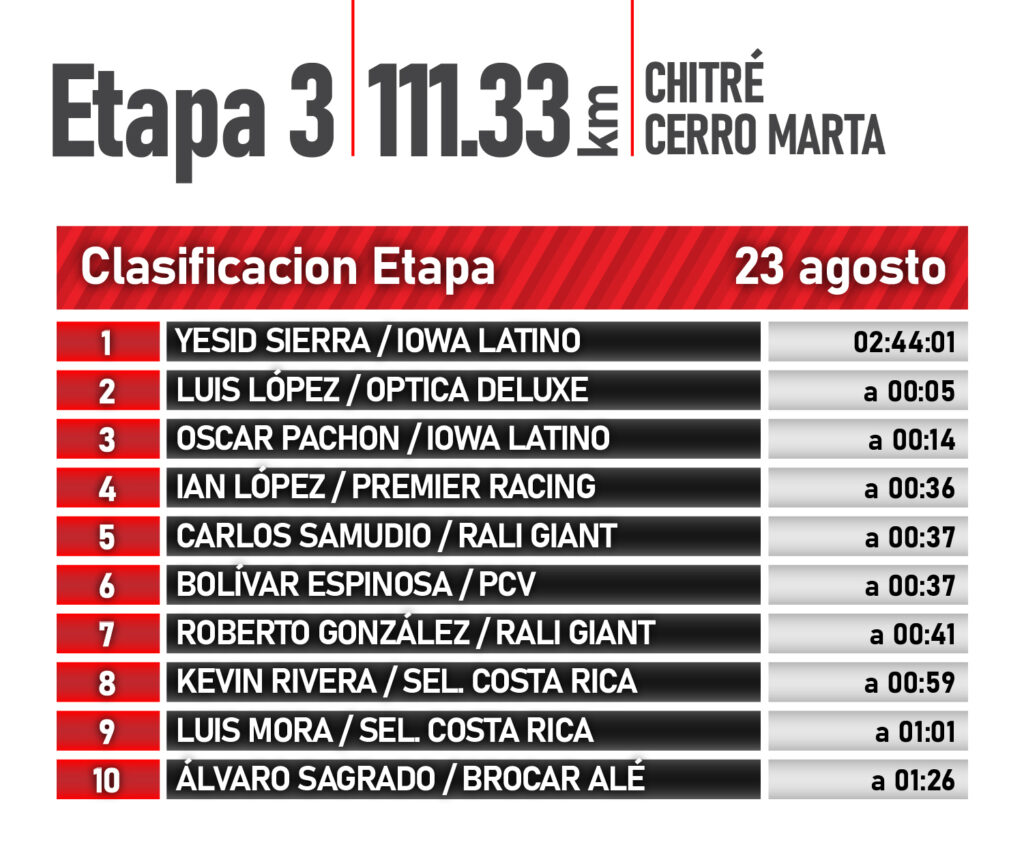 El colombiano Yesid Sierra se ha impuesto en la tercera etapa de la Vuelta a Panamá que ha finalizado en el alto Cerro Marta, tras 111,33 kilómetros de recorrido. El pelotón partió de Chitré. Luis López (Óptica de Luxe), nuevo líder. Álvaro Sagrado (Brocar Alé) ha sido décimo.