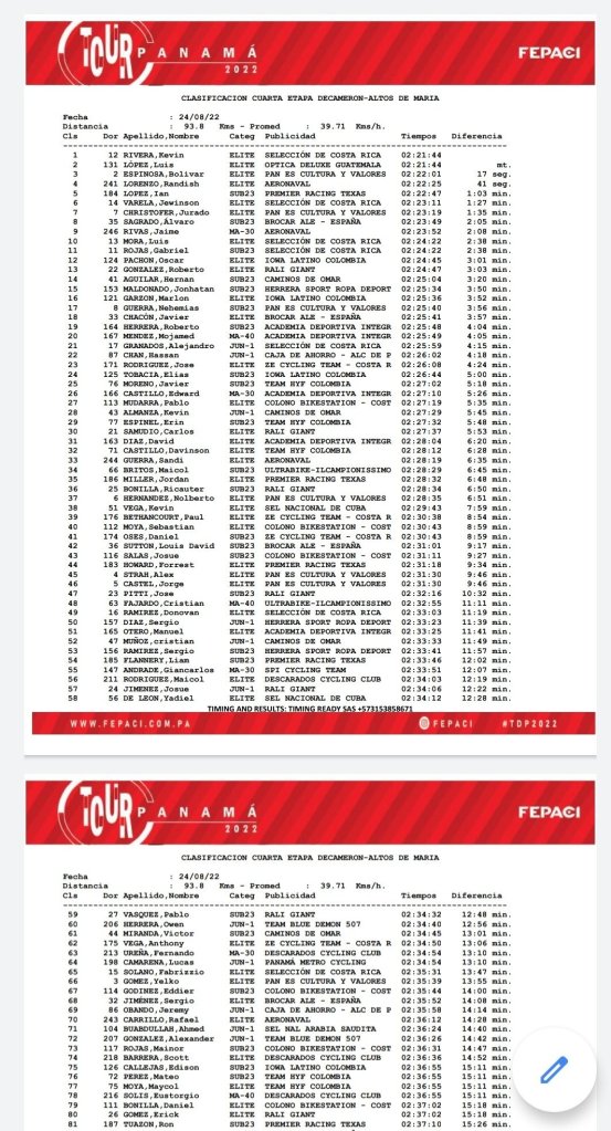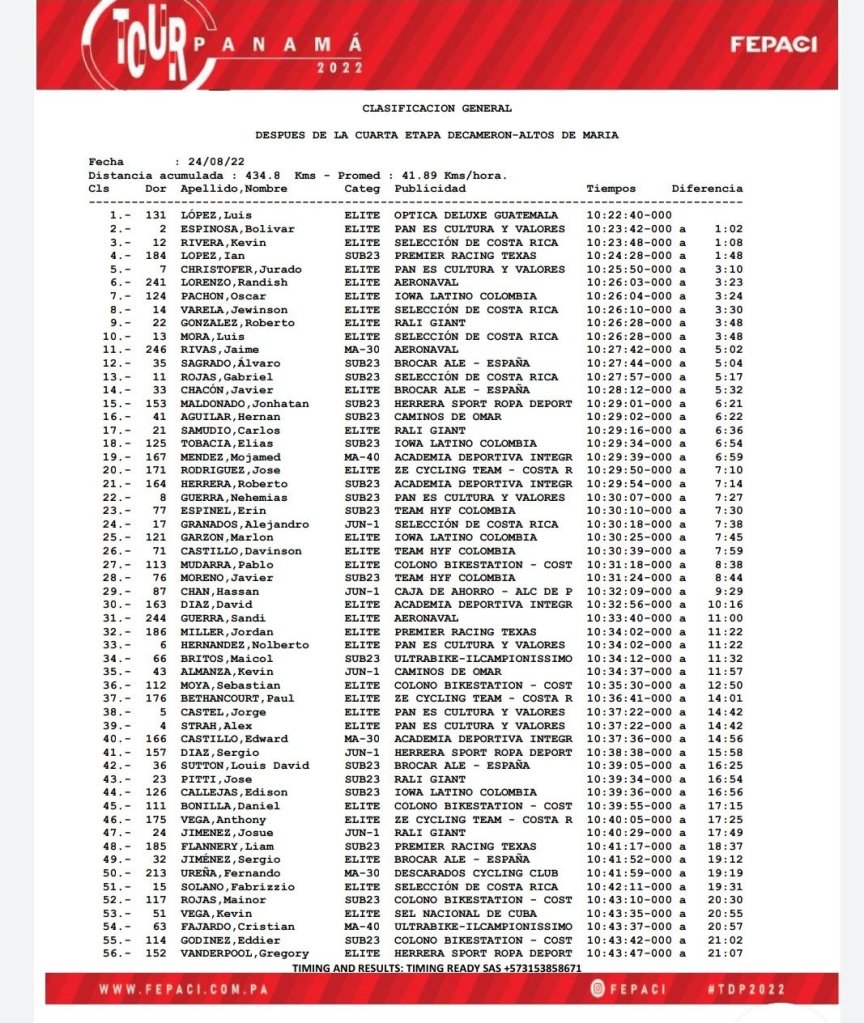 El costarricense Kevin Rivera ha sido el ganador de la cuarta etapa de la Vuelta Ciclista a Panamá que ha contado con 93,85 kilómetros y ha finalizado en los Altos del María. Álvaro Sagrado (Brocar Alé) acaba octavo. Luis López (Óptica Deluxe), que hoy ha terminado segundo, continúa de líder.