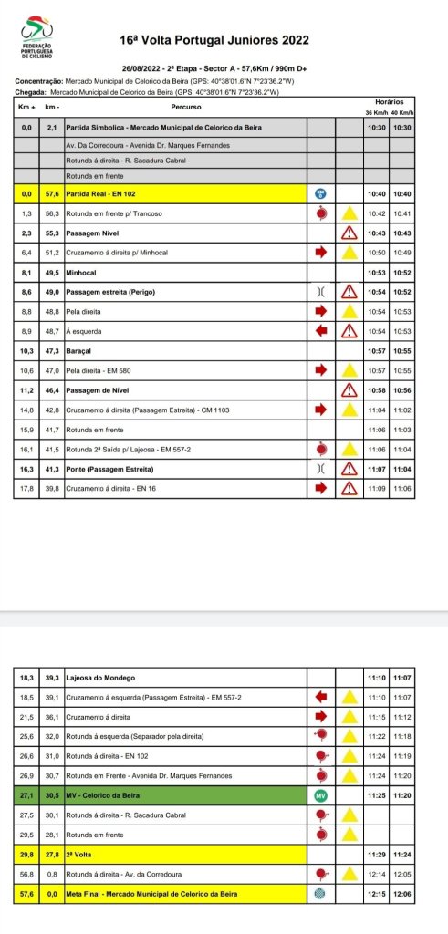 La segunda etapa, este viernes, se desarrolla en el municipio de Celorico da Beira, en dos sectores. A las 10:30 horas, la escuadra sale del Mercado Municipal para completar un recorrido de 57,6 kilómetros, con final previsto para las 12:00 horas, en el mismo lugar de la salida. Por la tarde, hay una contrarreloj individual de 10,8 kilómetros, entre Lajeosa do Mondego y el Mercado Celorico da Beira. El primer ciclista sale a las 16:00.