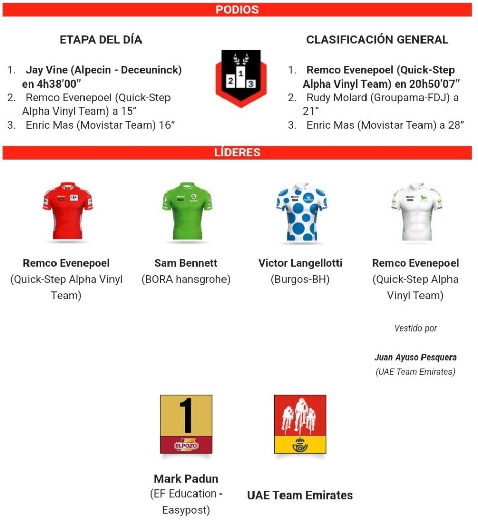 El alicantino Juan Ayuso ha confesado al final: «Estoy aprendiendo y creo que van de la mano hacer un buen resultado y aprender. Quinto en la general, habrá que mejorar y vamos a ir a por todas. Almeida tiene los galones y yo tengo que seguir trabajando día a día y ser regular. Voy recuperando sensaciones, porque en los primeros días en España lo pasé mal».