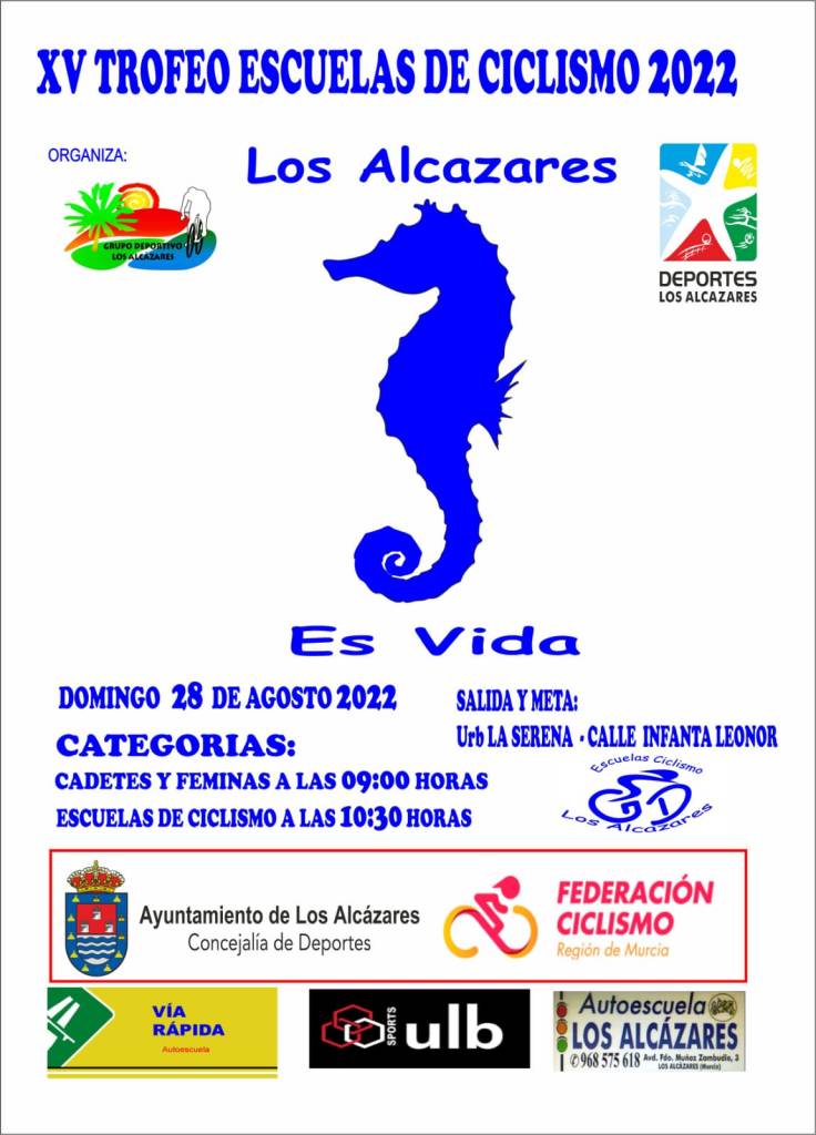 Este domingo 28 de agosto se va a celebrar en Los Alcázares una doble prueba de ciclismo. Se trata del XV Trofeo de Escuelas de Ciclismo. A las 9.00 horas del domingo comenzará la prueba de cadetes puntuable para la Copa Murcia en la que los más de 50 participantes completarán 45 kilómetros en un recorrido circular con salida y meta frente al cementerio de Los Alcázares. Los conjuntos alicantinos estarán en la salida después del competir el jueves en Llocnou d’En Fenollet.