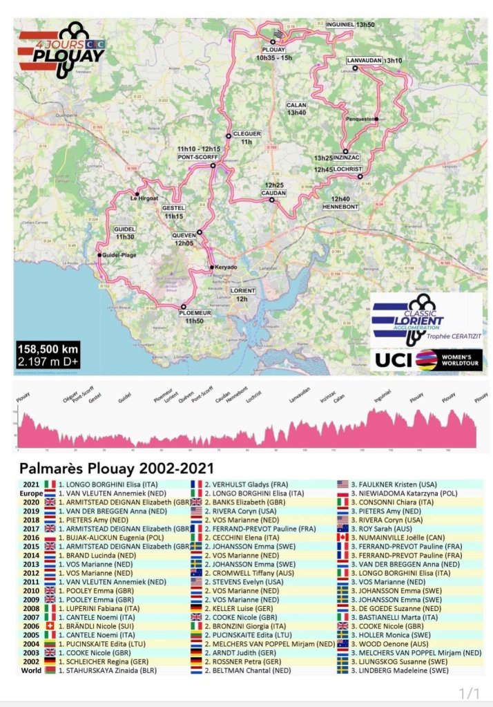 Serán 158 kilómetros de recorrido, casi al límite del reglamento UCI, con un circuito decisivo de 11,7 km en el que habrá tres cotas: Rostervel (1,5 km al 4,5%) y el encadenado de Lezot (900m al 5%) y Kerscoulic (225m a casi un 9%). Esta última ascensión se completará a 3,4 km de la llegada, y es por tanto una aproximación distinta -ya no se pasa Ty-Marrec- a la, por otra parte, clásica recta de llegada del Mundial de 2000.