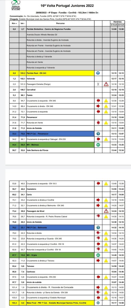 La Vuelta a Portugal Junior finaliza este domingo. Es la etapa reina, no por la longitud -103,3 kilómetros-, sino por la dificultad del recorrido. Los corredores saldrán de Fundão, a las 12:00 horas, para llegar a Covilhã, donde la meta coincide con un premio de montaña de primera categoría, alrededor de las 15:00 horas. Por el camino, aún habrá que superar las subidas de tercera categoría de Penamacor (km 33,3) y Belmonte (km 78,2).
