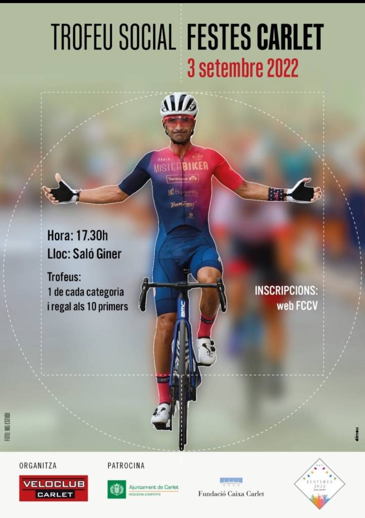 Hoy, 3 de septiembre, se disputa el Trofeu Social Festes de Carlet, a partir de las 17.30 horas, con la presencia de 186 corredores. El Veloclub Carlet, entidad organizadora, ha diseñado un circuito y el recorrido total es de 62.50 kilómetros.