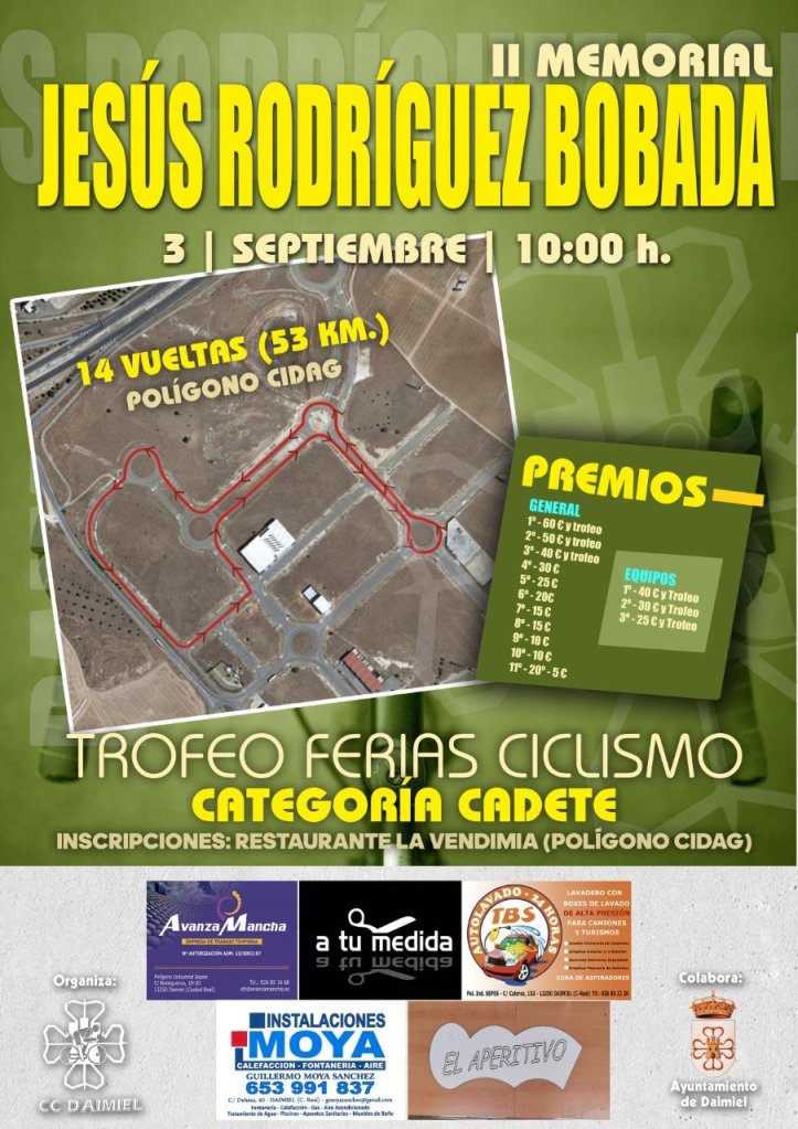 Hoy se disputa en Daimiel, a partir de las 10 horas, el Trofeo Ferias- II Memorial Jesús Rodríguez Bobada para corredores cadetes. Se darán 14 vueltas a un circuito situado en el Polígono Cidag hasta completar 53 kilómetros. Presencia en el pelotón, en esta prueba de carácter nacional, del equipo ilicitano Esetec Pikolinos.