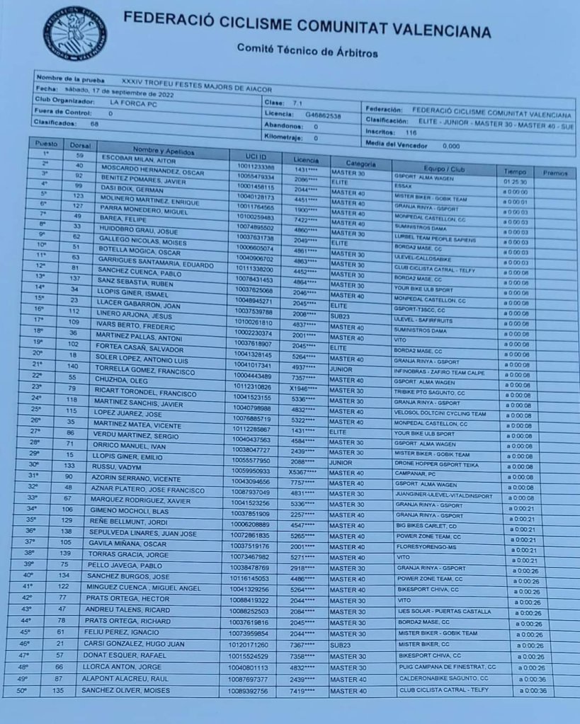 Aitor Escobar (Gsport) logra el triunfo en el XXXIV Trofeu Festes Majors de Aiacor. Óscar Moscardó (Essax) entró a continuación y Javier Benítez (Mister Biker) firma un tercer puesto bajo la pancarta de meta. Moscardó fue el primer élite; Joan Llacer (Ulevel) se impuso entre los sub 23; Antonio Luis Soler (Infinobras), en los júniors; Escobar fue el vencedor de los M30; Benítez, de los M40; Francisco Antonio Quesada (Vito), en M50; y Lidia Llacer, la mejor fémina.