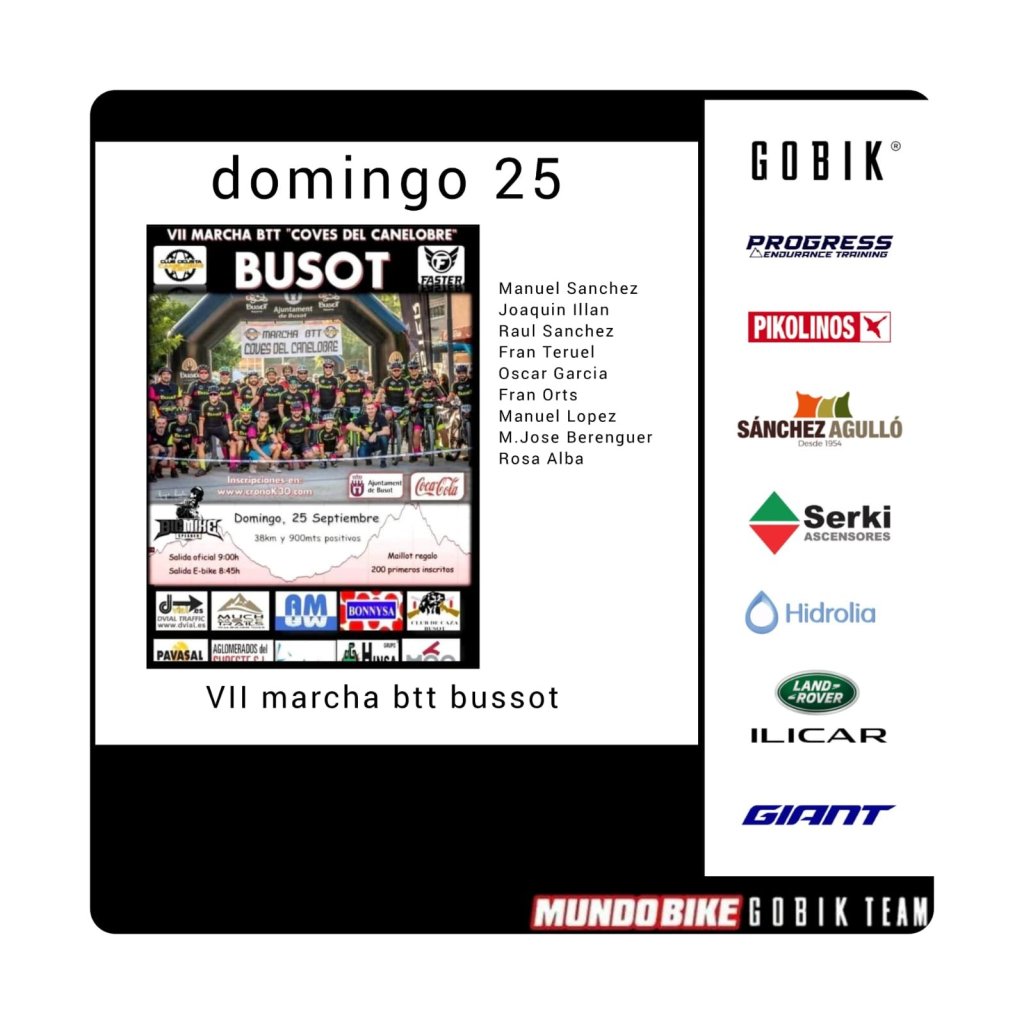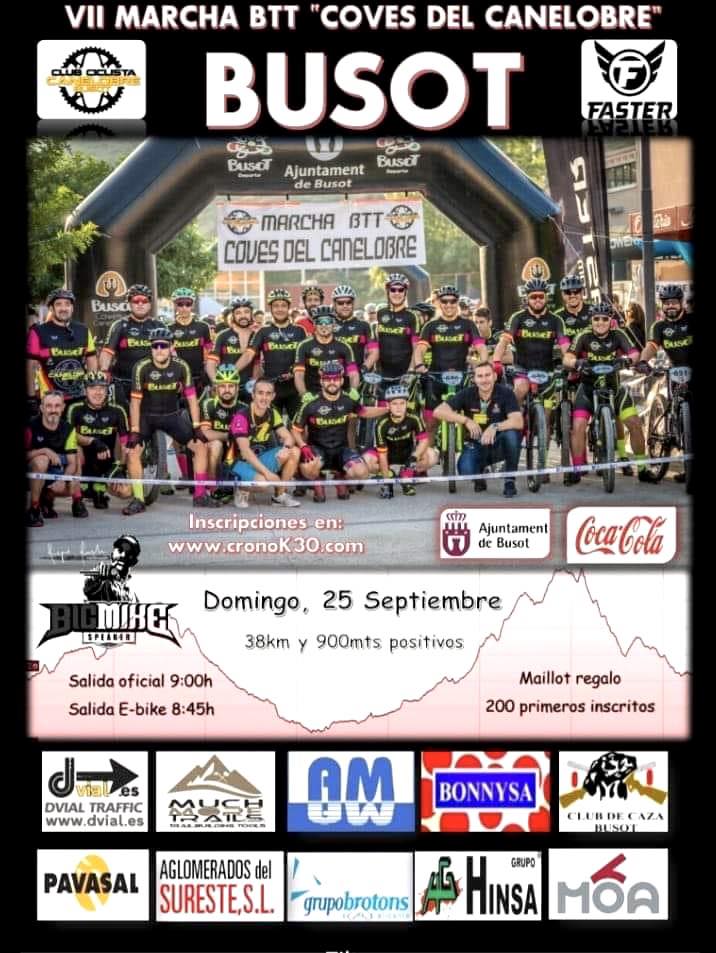 El domingo se disputa en Busot tenemos la VII Marcha BTT “Coves del Canelobre” que reunirá a cerca de 500 participantes. La salida oficial se dará a las nueve de la mañana y están previstos 38 kilómetros de recorrido y 900 metros positivos de desnivel.