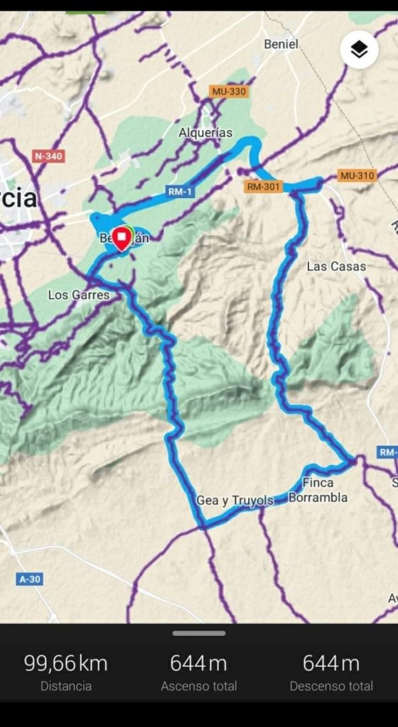 El recorrido consta de dos partes. La primera, un circuito semi urbano de 5,5 km al que se darán 8 vuelta completas y en la que habrá 4 metas volantes con sus respectivos premios. A la novena se gira hacia el Garruchal donde esta el primer premio de montaña, «GP Montaña Fernando Medina Paredes»con trofeo y obsequio. El trazado sigue hacia la Tercia antes de subir el Cabezo Sur donde esta el segundo premio de montaña, «Cima Jose Manuel García Galian», también con su trofeo y obsequio. La meta estará situada en La calle del Auditorio de Beniaján. El recorrido contasta de 99.66km y 644m de desnivel. Trofeos para los 3 primeros de la general, para los 3 primeros de cada categoría.