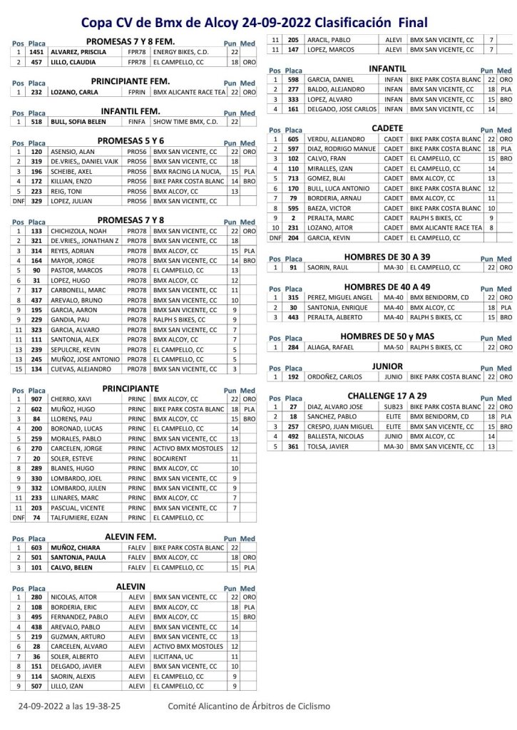 El Circuito Municipal de BMX de Alcoy ha acogido hoy la primera prueba puntuable para el ranking de la Copa de la Comunidad Valenciana de BMX de 2022. En Promesas 5 y 6, se ha impuesto Alan Asensio (BMX San Vicente); Noah Chichizola (BMX San Vicente) y Priscila Álvarez (Energy Bike), en Promesas 7 y 8; Xavi Cherro (BMX Alcoy) y Carla Lozano (Bmx Alicante), en Principiantes; Chiara Muñoz (Bike Park Costa Blanca) y Aitor Nicolás (BMX San Vicente), en Alevines; Daniel García (Biker Park Costa Blanca) y Belén Bull (Show), en Infantiles; Alejandro Verdú (Bike Park Costa Blanca), en Cadetes; Miguel Ángel Pérez (BMX Benidorm), en Hombres de 40 a 49; Carlos Ordóñez (Bike Park Costa Blanca), en júniors; José Díaz (Bike Park Costa Blanca), en Challenge 17 a 29; Raúl Saorín (El Campello), en Hombres de 30 a 39; Rafael Aliaga, en Hombres de 50 y más.