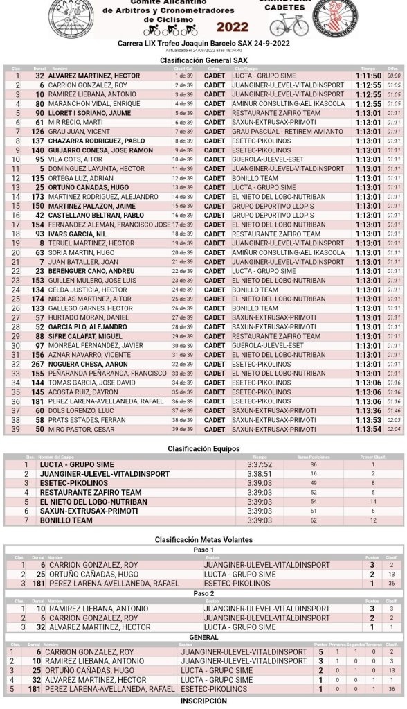Héctor Álvarez (Lucta-Grupo Sime) se ha impuesto hoy en solitario en el LIX Trofeo Joaquín Barceló disputado en Sax para corredores cadetes. Roy Carrión (JuanGiner) y Antonio Ramírez (JuanGiner) han completado el podio. Top 10 para Jaume Lloret (Zafiro Team), Martí Mir (Saxun) y de los Esetec Pikolinos Pablo Chazarra y José Ramón Guijarro.