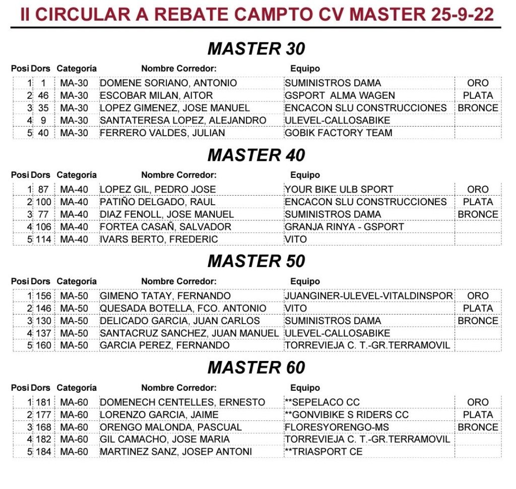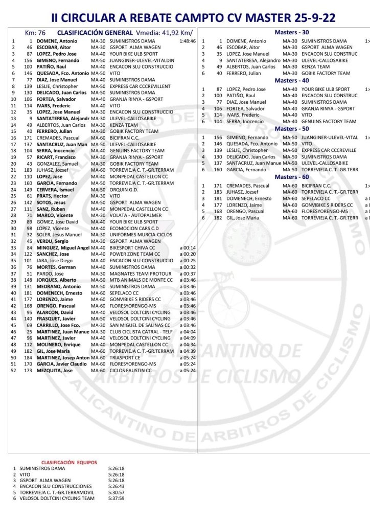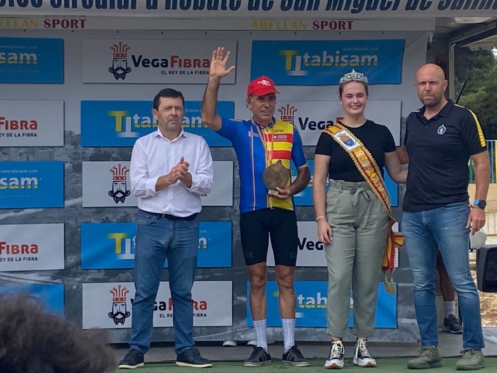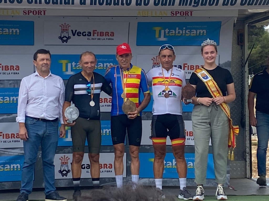 San Miguel de Salinas ha acogido hoy el Campeonato de la Comunitat Valenciana de las categorías Máster 2022. Antonio Domene se ha adjudicado el II Trofeo Circular a Rebate y el Club Ciclista San Miguel de Salinas, organizador del Autonómico, ha repartido los maillots de campeones autonómicos a Antonio Domene ( Suministros Dama), ganador del título en M30; Pedro José López ( Yourbike), en M40; Fernando Gimeno (JuanGiner), en M50; y Ernesto Domenech (Sepelaco), en M60.