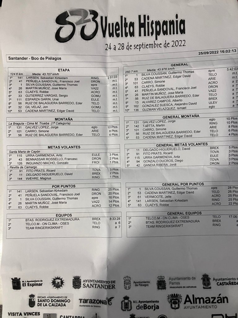 Sebastián Kirkedam Larsen (Team Ringerikskraft) ha sido el ganador de la segunda etapa de la Vuelta Ciclista a Hispania Sub 23 que ha unido Santander y Boo de Piélagos. Francisco Joel Peñuela (Drone Hopper) ha sido segundo y Guillermo Thomas Silva Cousan (Previley) tercero. Silva es el nuevo líder, con el mismo tiempo que Edgar David Cadena (Telcom) y Simone Carro (Arie). El alicantino Javi Morante ha pinchado en el puerto y se ha quedado sin opciones de ayudar a Thomas en la parte final de la etapa. Antonio Lozano (Esetec Salazones Ricardo Fuentes) ha abandonado por enfermedad.