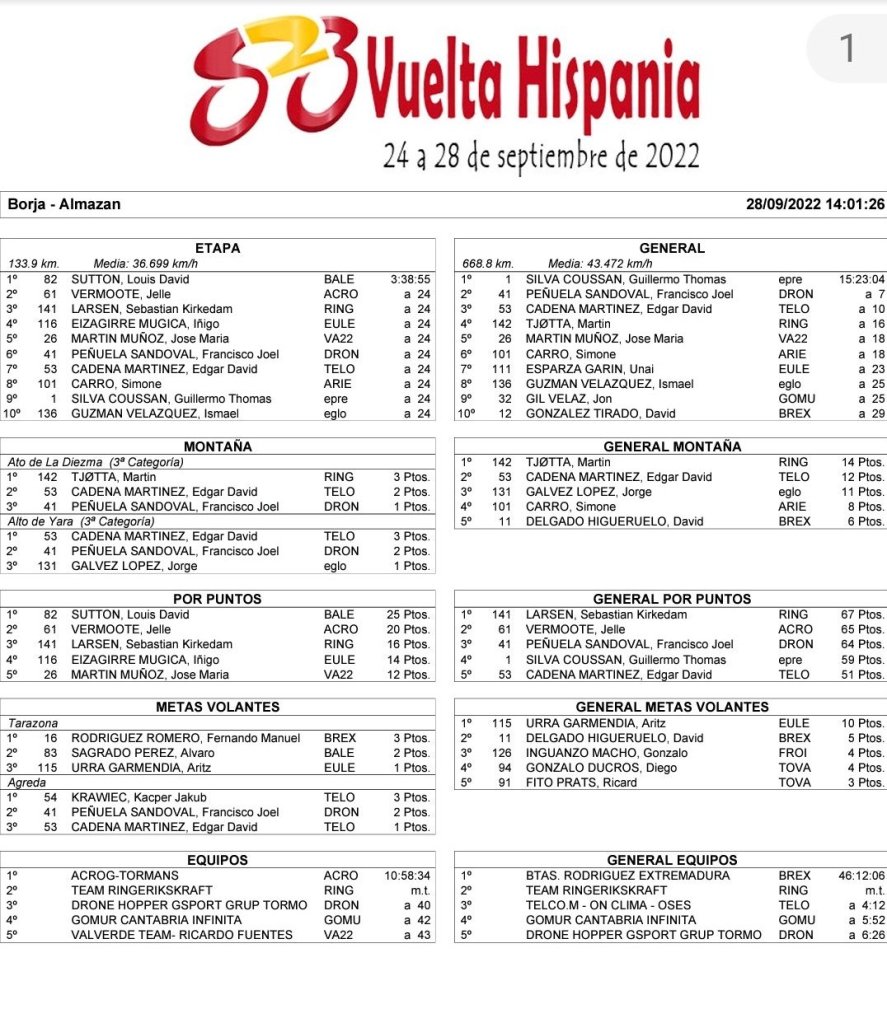 Louis Sutton (Brocar Alé) se ha adjudicado la última etapa de la Vuelta Ciclista a Hispania Sub 23. El británico ha llevado en solitario a Almazán después de un ataque en la parte final de la jornada. Tras 133,9 kilómetros de recorrido ha parado el reloj en las 3:38:55. A 24 segundos han atravesado la línea de meta Jelle Vermoote (Acro) y Sebastián Kirkedam Larsen (Ringerikskraft Team). El uruguayo Thomas Silva (Previley-Maglia-Coforma-Bembibre) se ha llevado la general. No lo ha tenido fácil ya que los ataques le han llegado de todas las partes y el viento ha hecho daño. Llegó a estar contra las cuerdas. El ilicitano Javi Morante ha vivido en primera persona el triunfo de su líder. «Hemos trabajado todo lo posible los compañeros y cuando no podíamos más se quedó Thomas delante para resolver la carrera», explica Morante.
