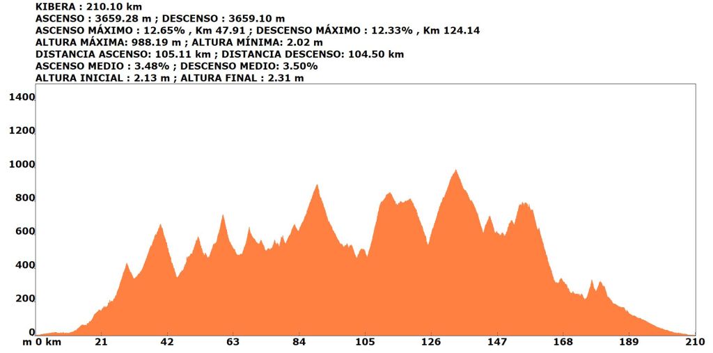 En este punto la marcha se bifurcará en dos, Kibera o Soweto. La marcha larga, Kibera, seguirá por la CV215 hasta el desvío de Algimia de Almonacid donde seguirá dirección Gaibiel, pasando por Matet; a partir de Gaibiel enlazará con la CV203 hasta el desvío para llegar a Montanejos, pasando por Montán, subiendo el puerto de Arenillas y siguiendo por la misma carretera para llegar a Zucaina.Continuará por la CV190 dirección Castillo de Villamalefa para subir el puerto del Remolcaor donde, antes de llegar a Lucena del Cid, se desviará para subir el Salto del Caballo y bajar hasta Argelita, siguiendo por Fanzara hasta llegar a Onda donde la marcha enlazará con el recorrido corto (Soweto) hasta la meta en Burriana.