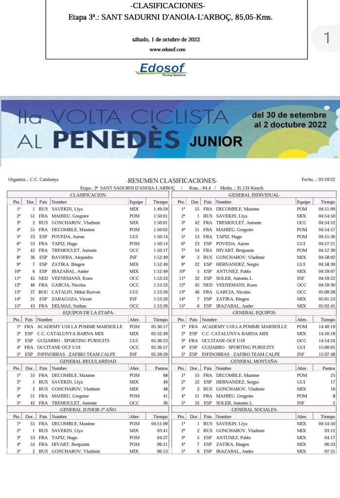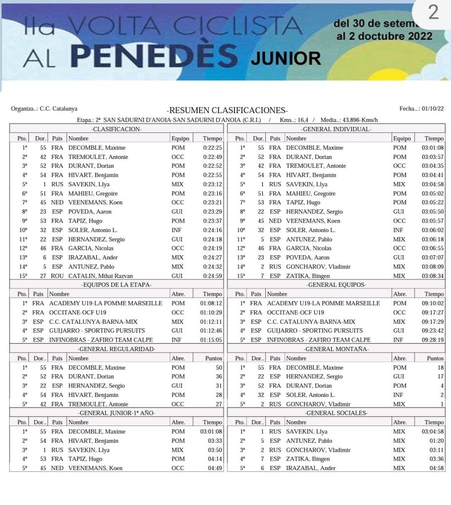 En la prueba en línea de la tarde, que ha unido Sant Sadurní D’Anoia y L’Arboç, de 85,05 kilómetros, la victoria ha sido para Llay Savekin (CC Catalunya-Barna). Aarón Poveda ha entrado en quinta posición; Alejandro Baviera (Infinobras), en octava; Mihai Razvan Catalin (Guijarro), en el puesto 13; y Vicent Zaragoza (Infinobras), en el 14. Decomble es líder, por delante de Savekin y Tremoulet. Aarón Poveda es sexto y Sergio Hernández, noveno.