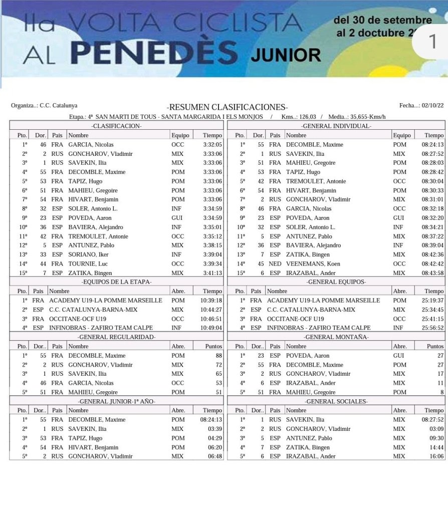 En la general final. Decomble ha tenido a su lado a Ilía Savekin y Gregorie Mathieu (La Pomme Marseille). Aarón Poveda y Antonio Luis Soler ha terminado noveno y décimo, respectivamente. Además, Poveda se ha llevado el maillot de la montaña y el Infinobras finaliza cuarto por escuadras.