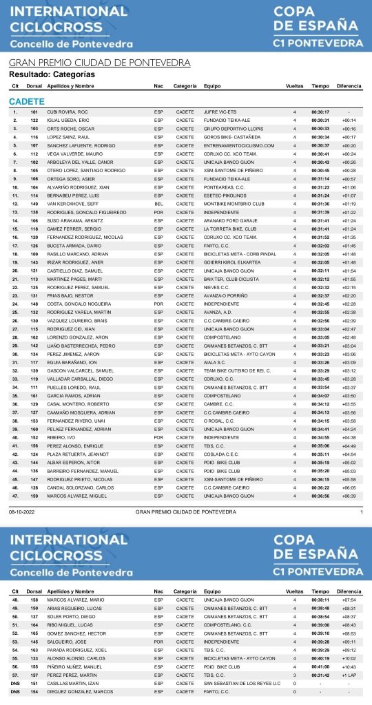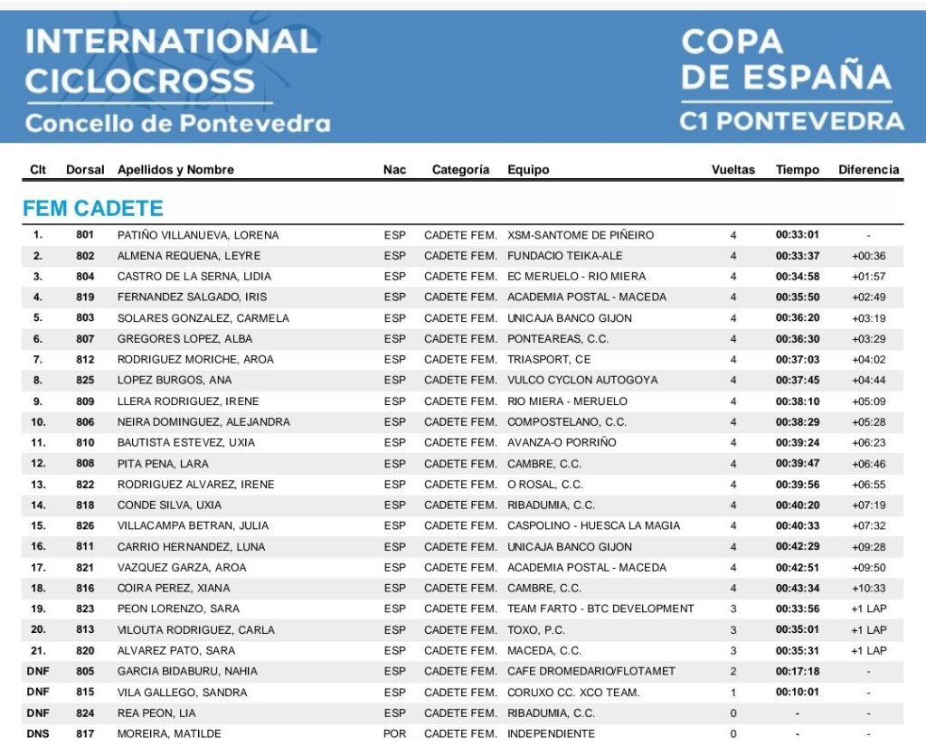 En cadetes, Lorena Patiño y Roc Cubí volvieron a lograr la primera posición en Pontevedra. En la categoría masculina los valencianos Eric Igual (Teika) y Óscar Orts (GD Llopis) completaron el podio. Novena plaza para Asier Ortega (Teika) y undécima para Luis Bernabéu (Esetec Pikolinos). En féminas, Leyre Almena (Teika) y Lidia Castrol suben al segundo y tercer cajón del podio. Puesto séptimo por Aroa Rodríguez (Triasport).