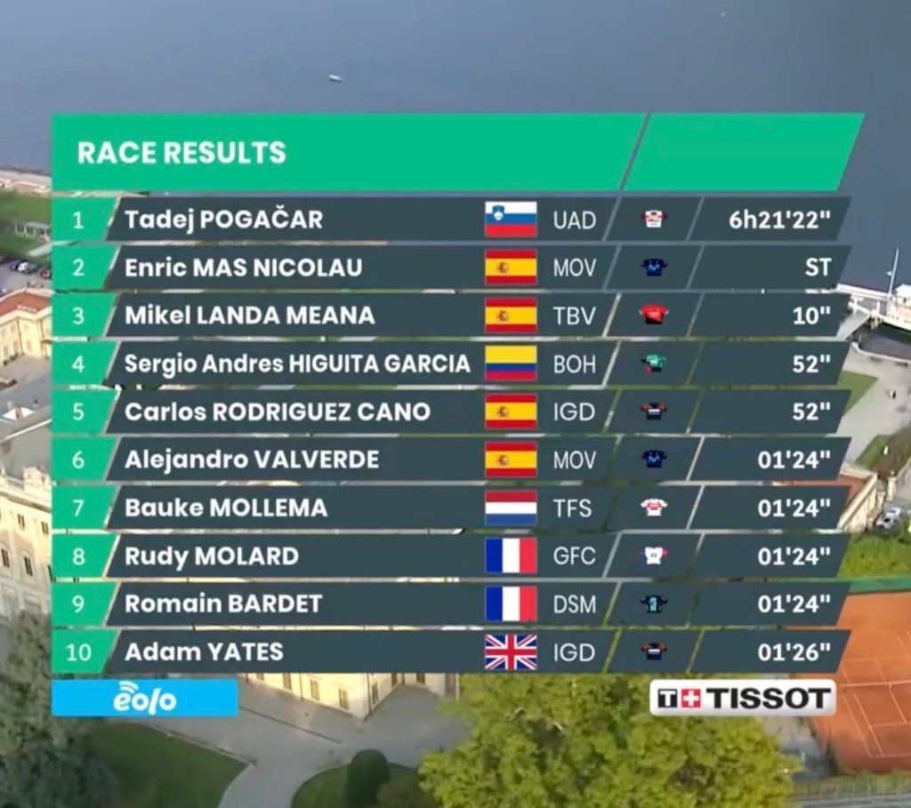 Tadej Pogacar revalidó este sábado su triunfo en la Vuelta a Lombardía tras superar al esprint a Enric Mas (Movistar Team). Mikel Landa (Bahrain Victorious) completaba el podio unos segundos después. Alejandro Valverde (Movistar) firma una sexta plaza en su última carrera como profesional .