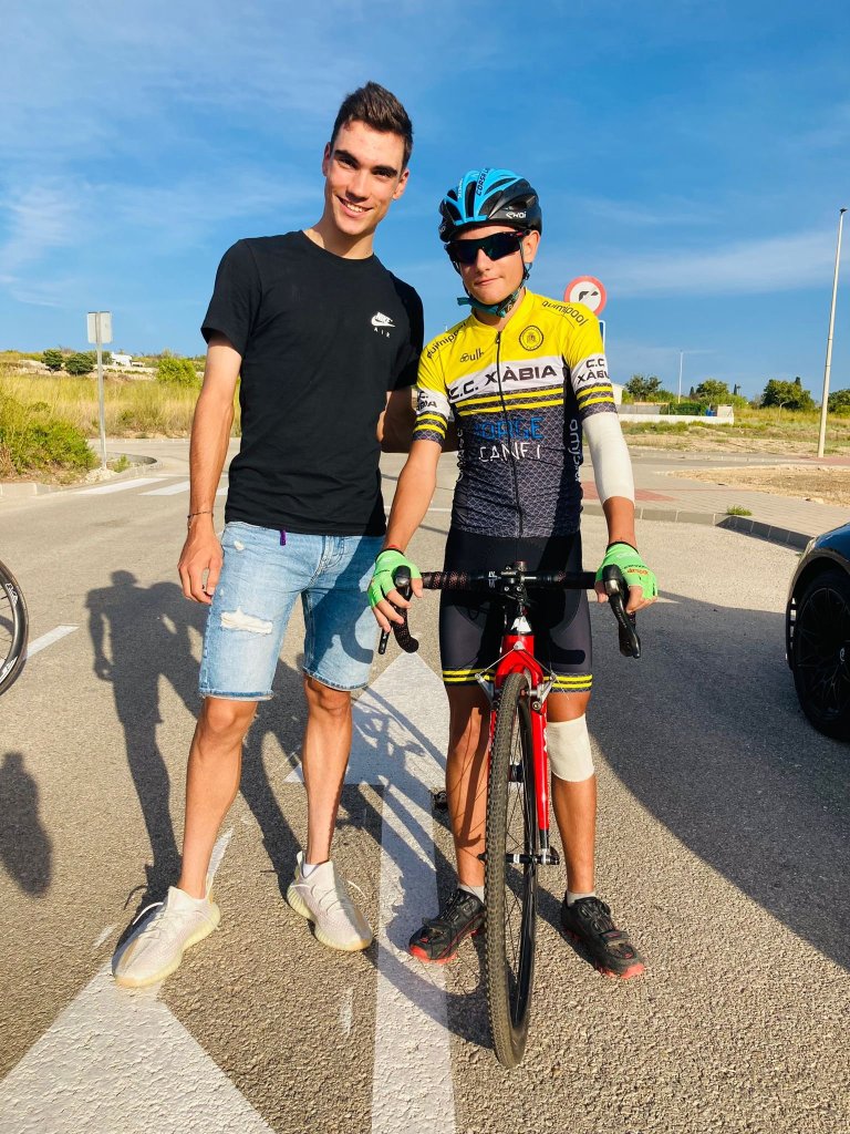 El flamante tercer clasificado en la pasada Vuelta Ciclista a España 2022, el xaviense Juan Ayuso, apareció en los entrenamientos que realiza habitualmente su antigua escuela, la del CC Xavia, en las faldas del Montgó. El ciclista del UAE Emirates quiso estar de primera mano con los jóvenes ciclistas del pueblo que tanto le estiman y adoran como su héroe y máxime tras lograr el podio en la pasada ronda española.