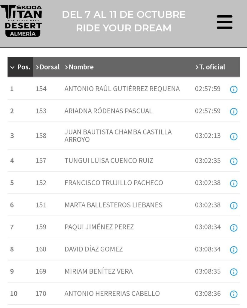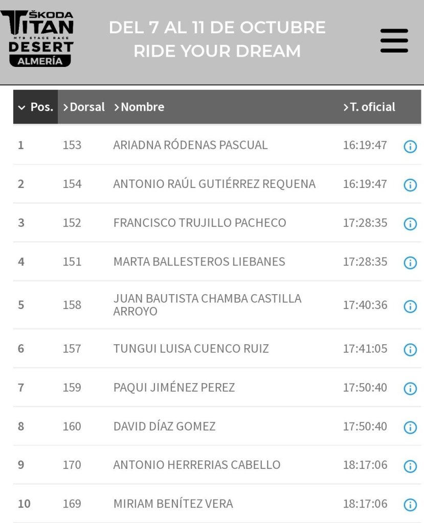 La misma solvencia y el mismo dominio de la prueba ha mostrado Vera Looser, ganadora en categoría femenina de esta Titan Desert. Llegó la primera en tres de las cuatro etapas de la competición, y no dejó opción alguna a Pilar Fernández, que ganó la cuarta etapa, y Misha Sekulova, que completaron el podio femenino. Y en el dúo mixto, Ariadna Ródenas y Antonio Gutiérrez también se ha mostrado muy superiores al resto de parejas ganando la prólogo y la cuatro etapas disputadas. Ya cuentan en su vitrina con el Finisher de la Skoda Titán Desert.