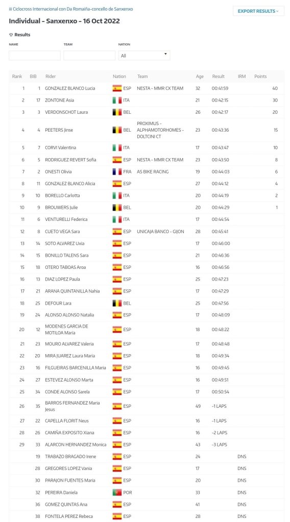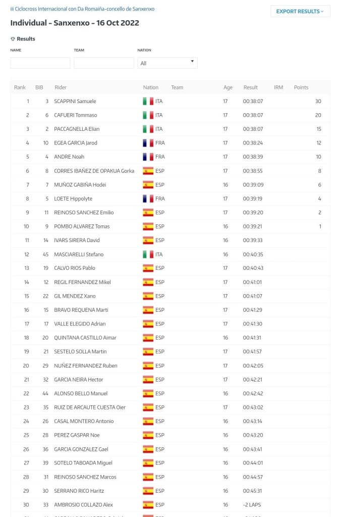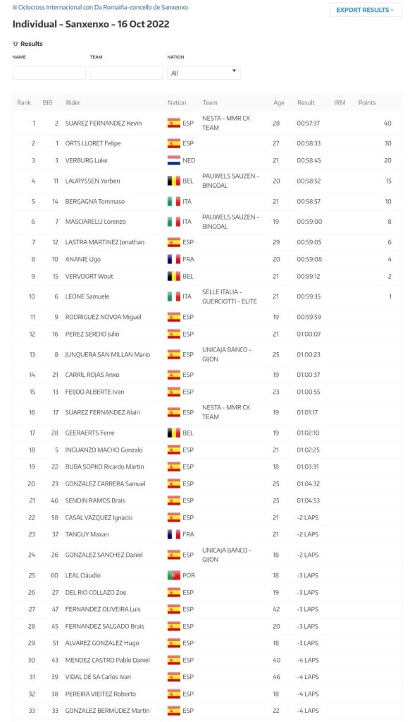 Kevin Suárez (Nesta) ha sido hoy el ganador del Ciclocross Internacional Da Romaiña disputado en Sanxenso. Felipe Orts (BH) ha sido segundo y Luke Verbug, tercero. En féminas, Lucía González (Nesta) se ha impuesto a Asia Zontone y Laura Verdonschot. Puesto 14 para Sara Bonillo (CX Sueca. Samuel Scappini se ha impuesto en júniors y undécima plaza para David Ivars (Fundación Benicadell).