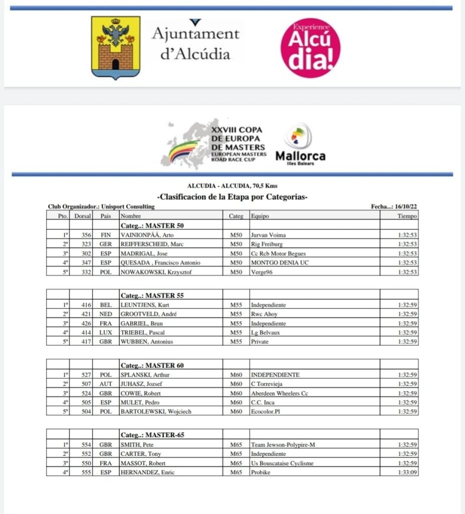 Jozsef Juhasz, del CC Torrevieja-Cycling Team- Grupo Terramovil, logra la medalla de plata, en la categoría M60, en la XXVIII Copa de Europa Máster disputada el domingo en Alcúdia. Arthur Splanski fue el ganador y Robert Cowie finalizó tercero. Una carrera fantástica que le permitió proclamarse subcampeón de Europa y poner el broche de oro a la temporada.