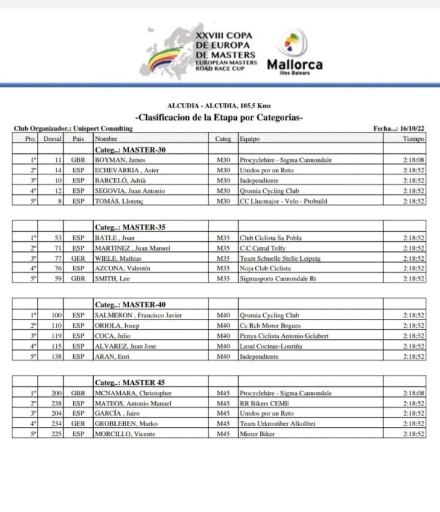 Los corredores británicos y españoles acapararon la mayoría de las medallas de la XVIII Copa de Europa de Ciclismo de categoría Masters. España sumo 10, con dos oros cuatro platas y cuatro bronces. Los dos oros han sido para los corredores mallorquines Joan Batle, en categoría Masters 35, y Francisco Javier Salmerón, en Masters 40. Sin embargo, el país que más veces ha subido a lo alto del podio ha sido Gran Bretaña, con los tres oros logrados por James Boyman (Masters 30), Chris McNamara (Masters 45) y Pete Smith (Masters 65).