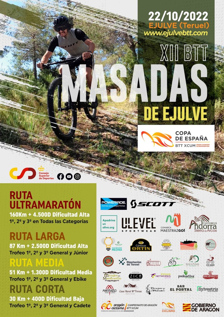 La Copa de España de XC Ultramaratón vivirá este próximo sábado 22 de octubre su última capítulo de la temporada 2022 en la localidad turolense de Ejulve. La XII Edición del BTT Masadas de Ejulve formará parte por primera del calendario de la Copa de España y, además de decidir también los nuevos campeones de Aragón de la especialidad, será la encargada de determinar quienes se adjudican la general en las distintas categorías que contempla el circuito nacional.